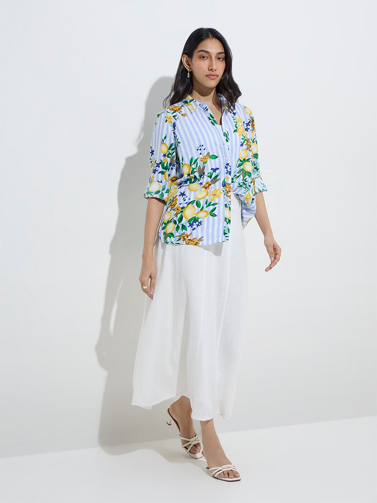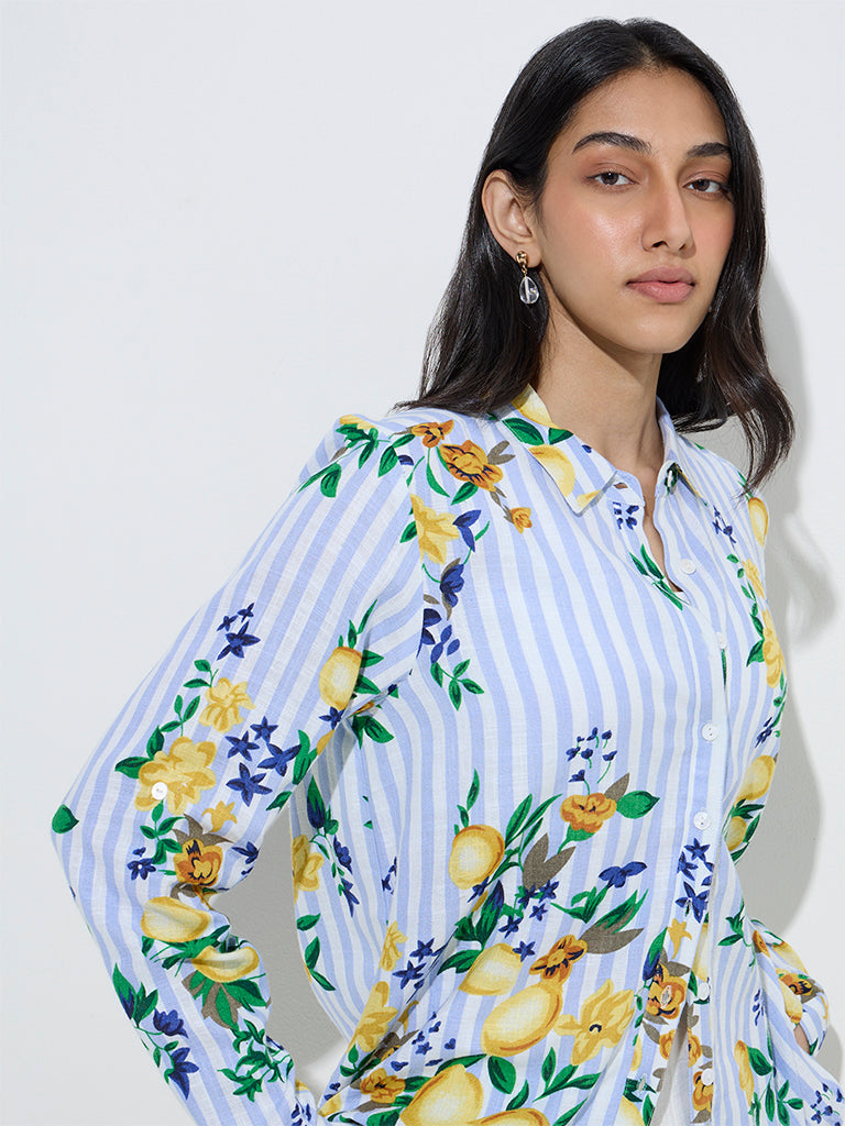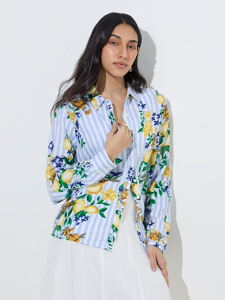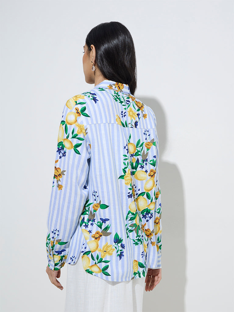 LOV Blue Botanical Design Linen-Blend Shirt