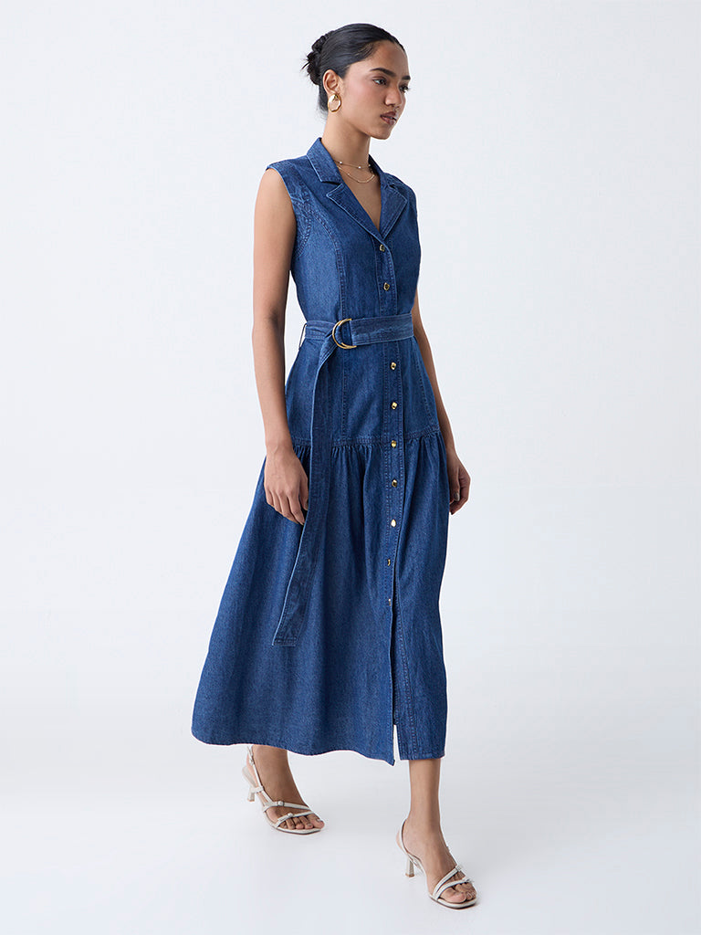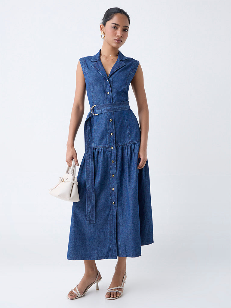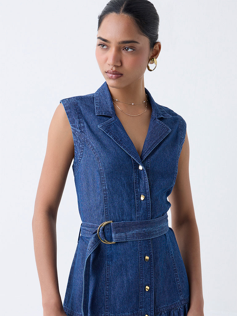 Effortlessly modern. this blue denim shirtdress by LOV is your answer to everyday chic. The notched lapel collar flows into a gold-toned button placket. lending a touch of polish to the sleeveless silhouette. A detachable belt lets you define your waist—or wear it loose for a more relaxed take on denim dressing.