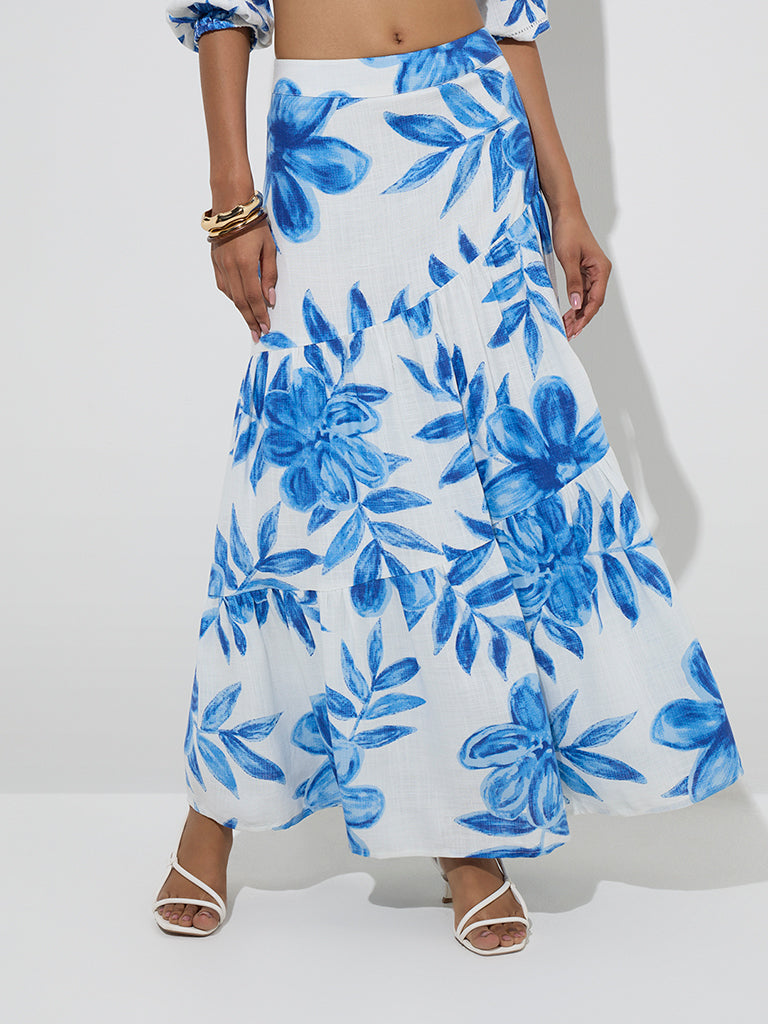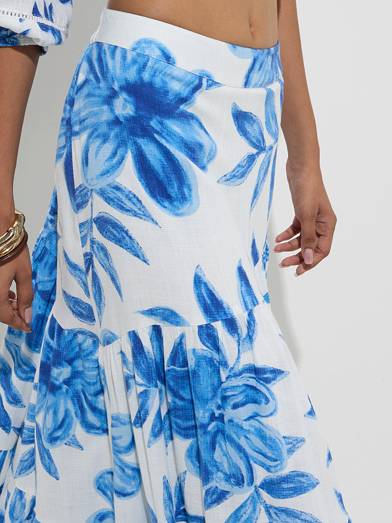 Adorned with vibrant foliage-inspired motifs. this blue skirt from LOV is woven from a premium linen-blend fabric for a breezy feel. Designed with an elasticized waist for a comfortable fit. it’s a lively choice for summer brunches. vacations. and casual outings.