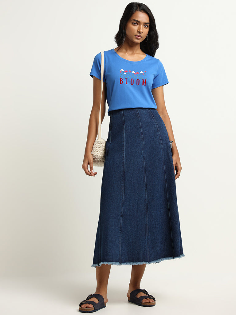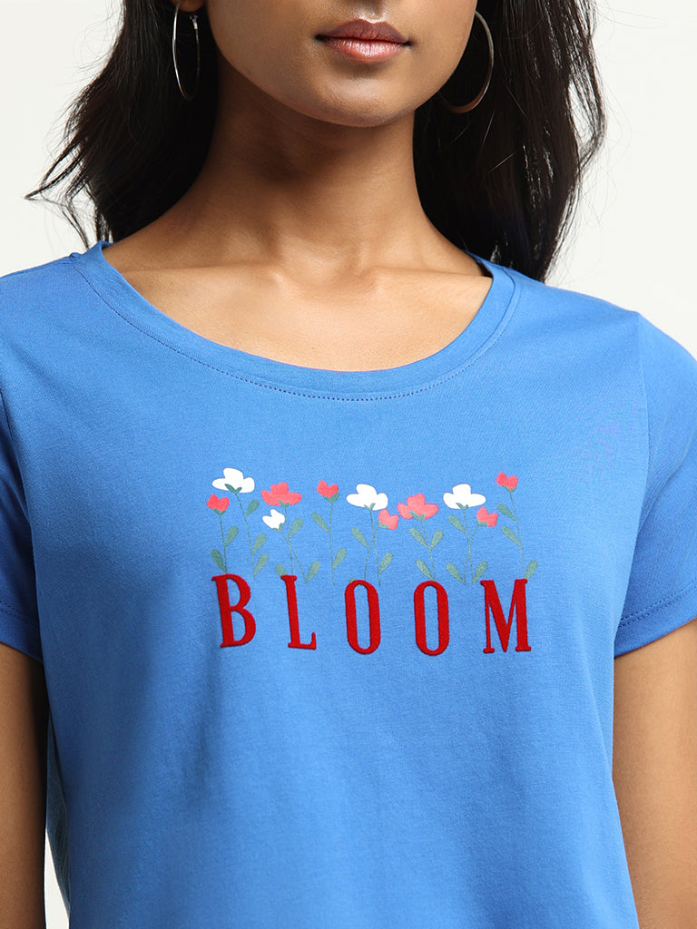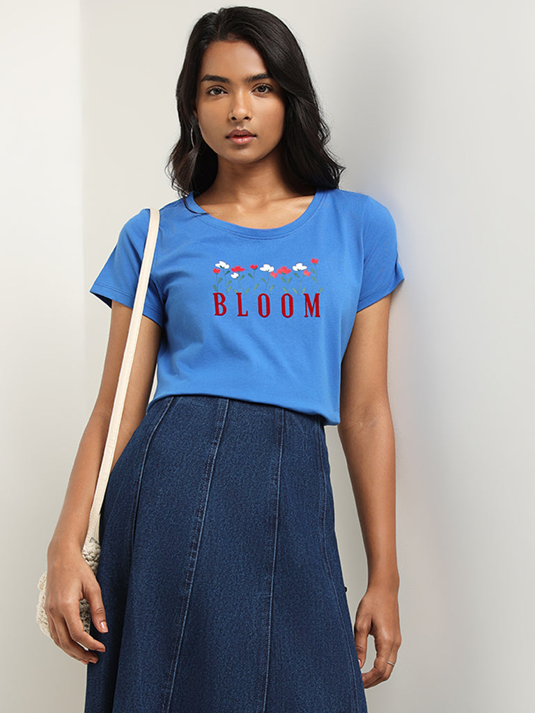 This LOV blue t-shirt. has a cheerful bloom graphic print and delicate floral accents. a round neck. short sleeve.