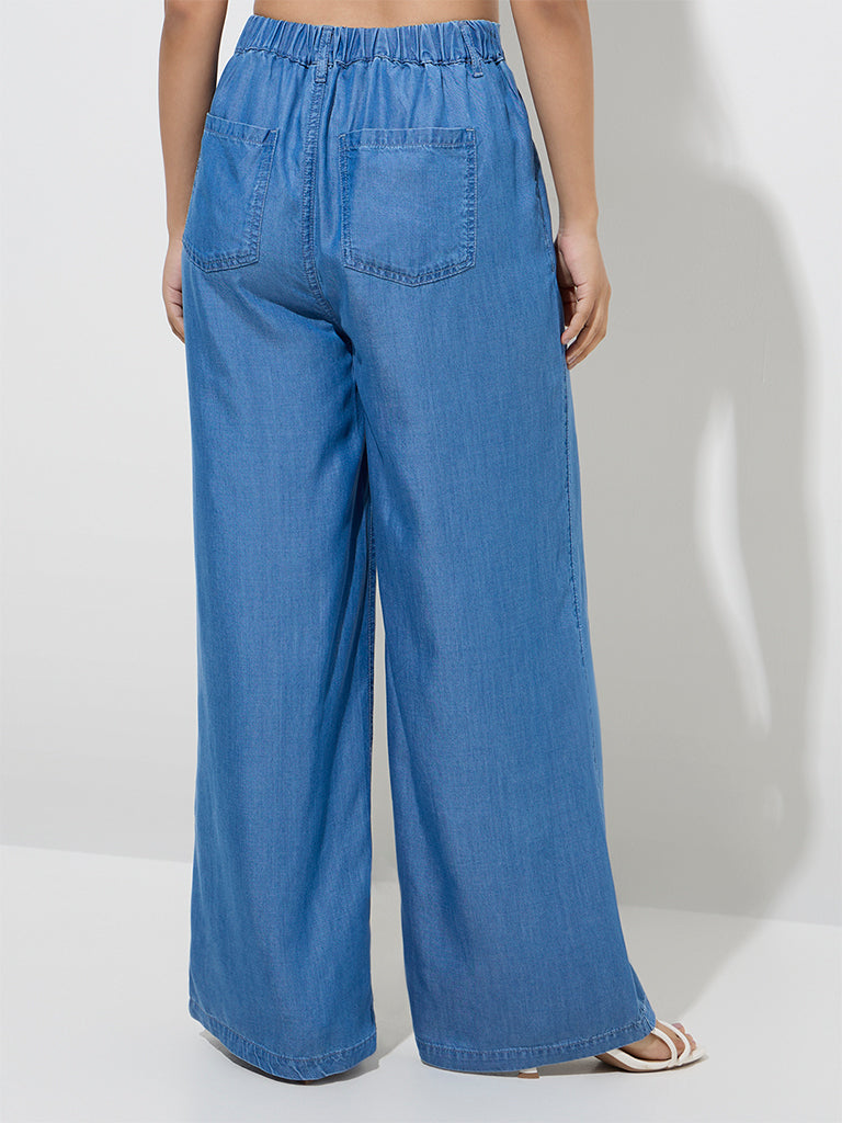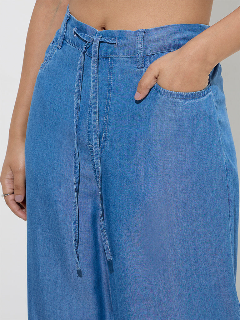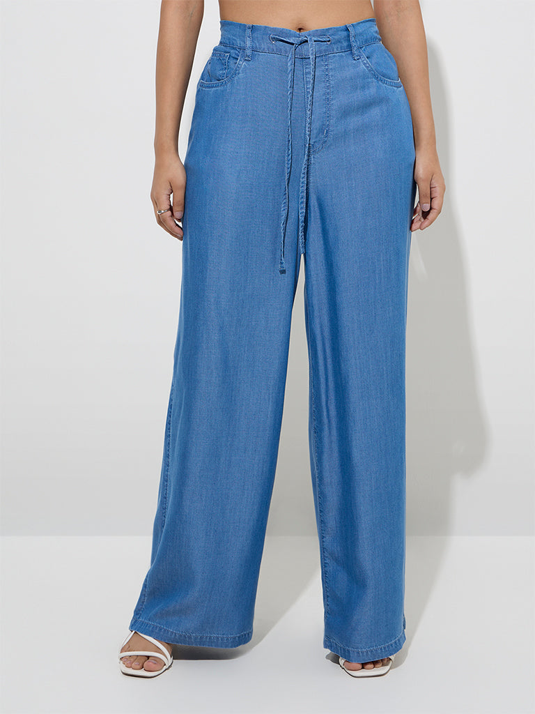 LOV brings you these blue denim trousers. tailored from an ultra-lightweight fabric for everyday ease. Featuring an elasticated waistband with drawstrings and belt loops. this relaxed-fit pair is complete with multiple utility pockets for a casual yet functional vibe.