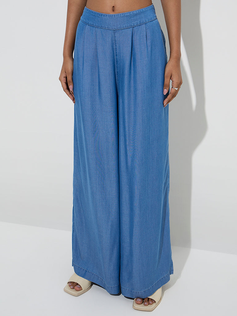 Tailored for comfort and style. these blue chambray pants from LOV feature an elasticated waistband for a perfect fit. Designed with functional side pockets. they offer effortless versatility for everyday wear.