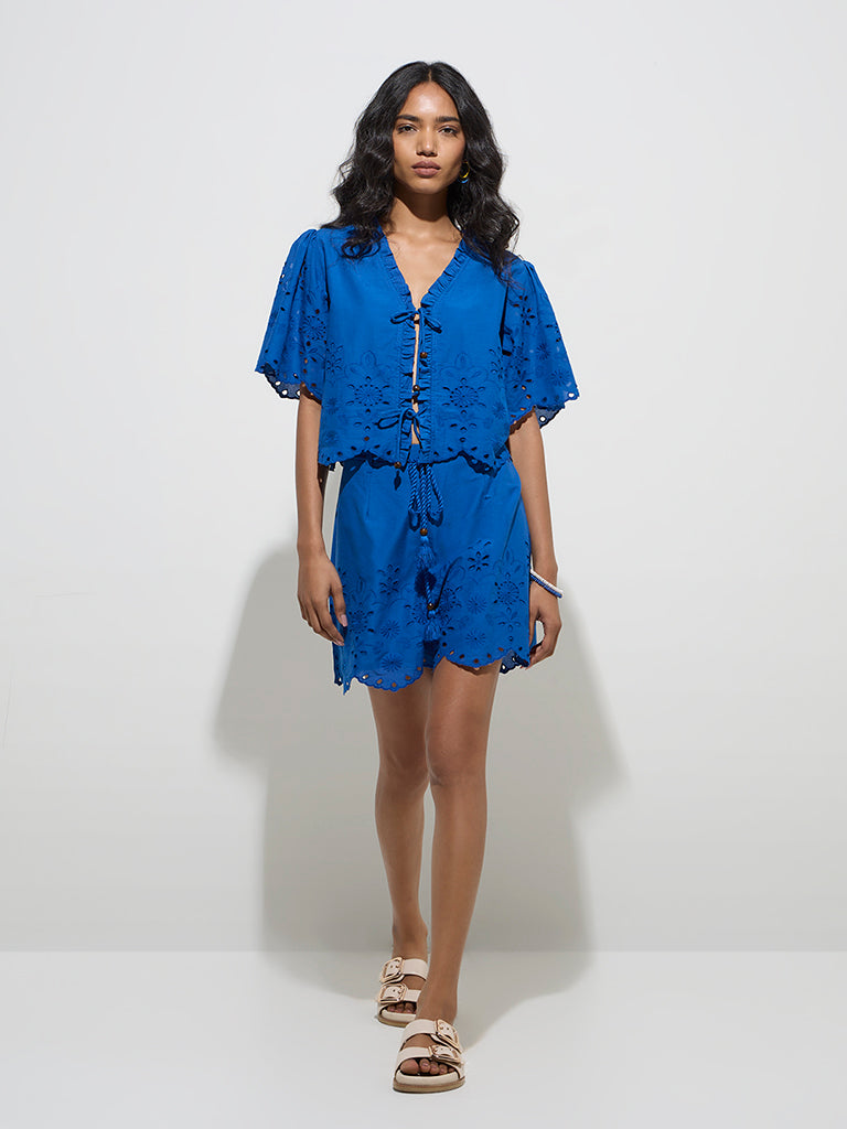 LOV Blue Schiffli High-Rise Cotton Shorts With Belt