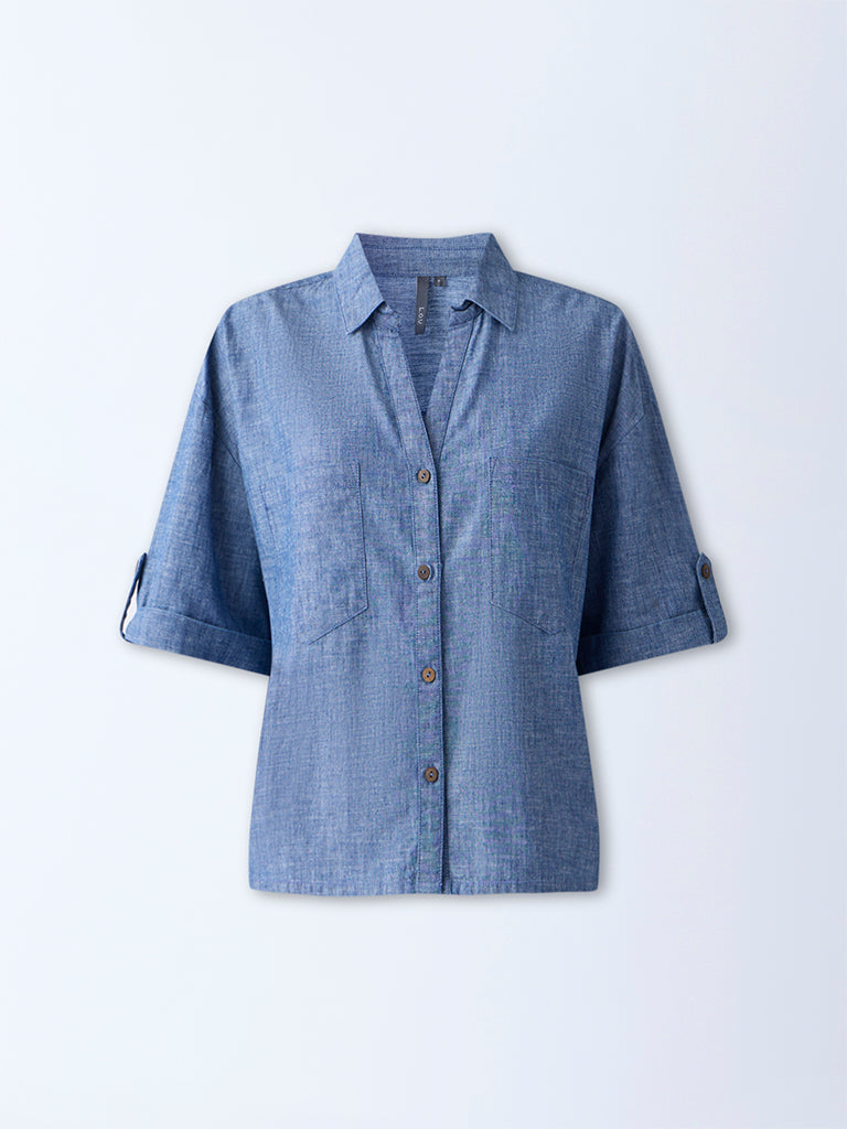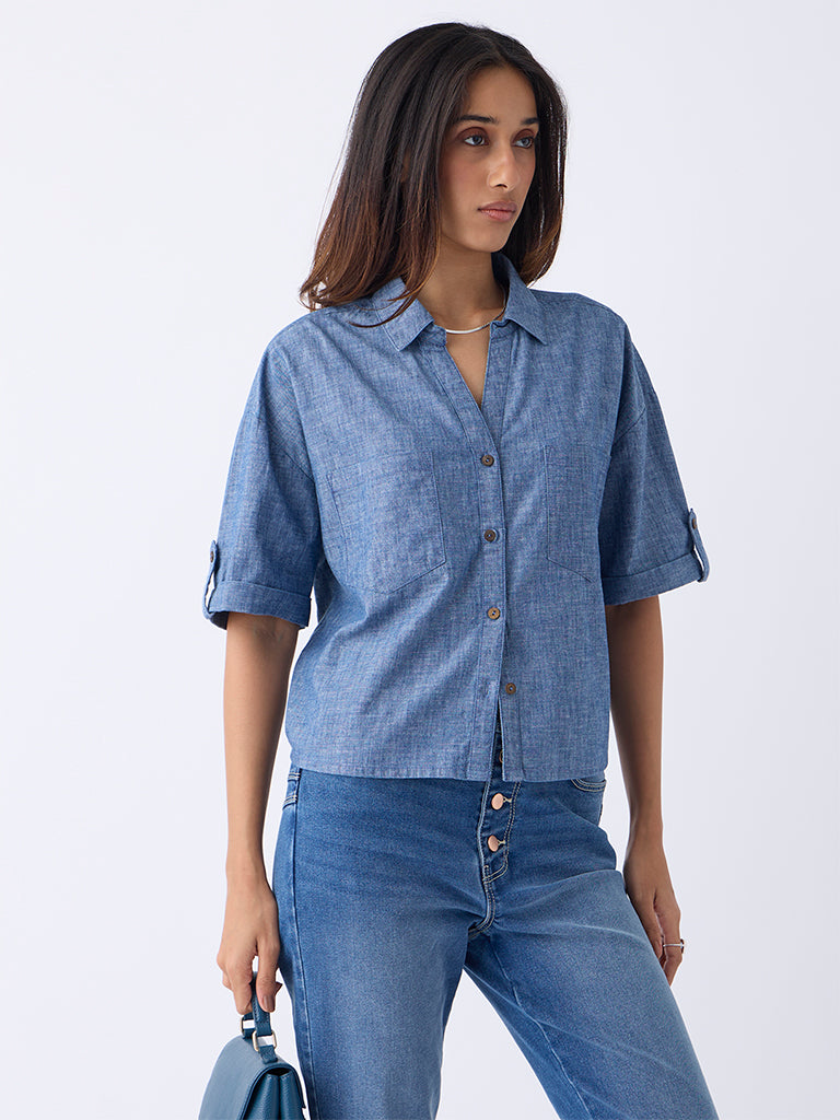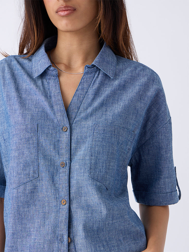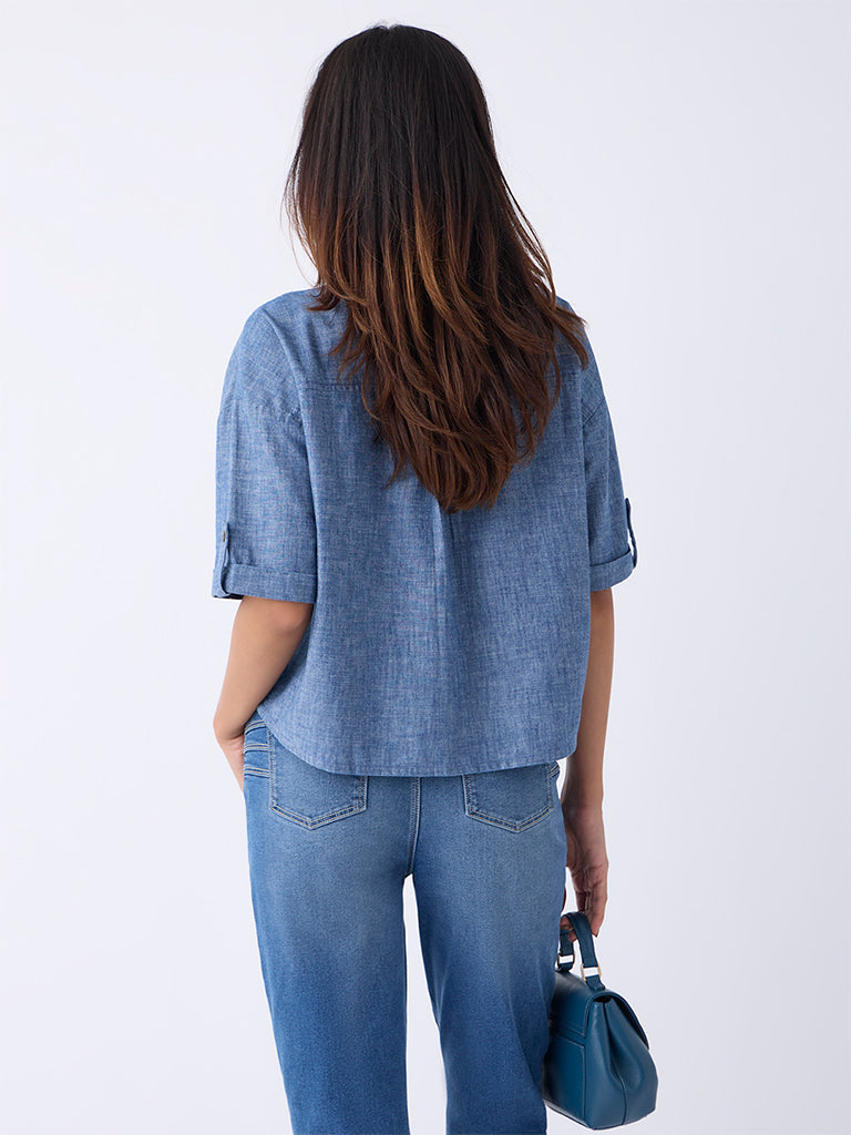 LOV launches this denim blue shirt as a contemporary staple with timeless appeal. Crafted from premium fabric. it features a collared neckline. button placket. and short sleeves. Two front pockets add charm and functionality. making it a piece you’ll wear season after season.