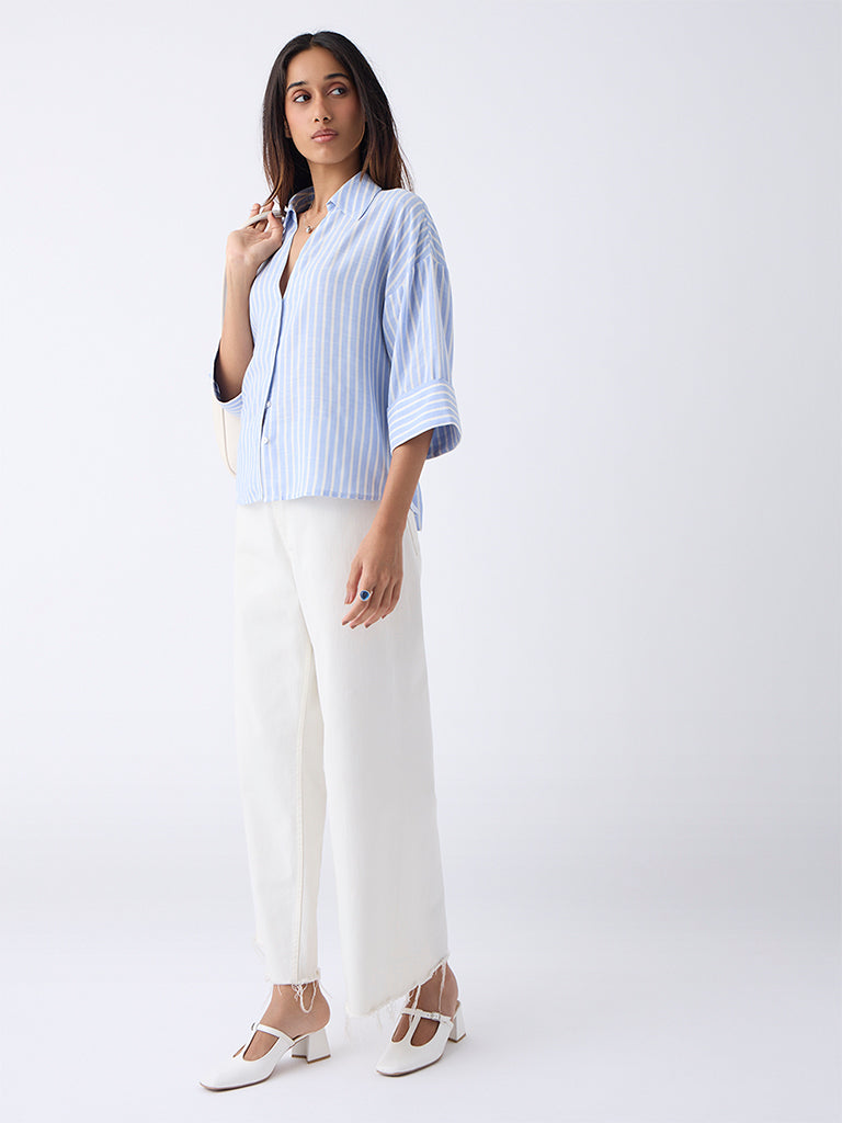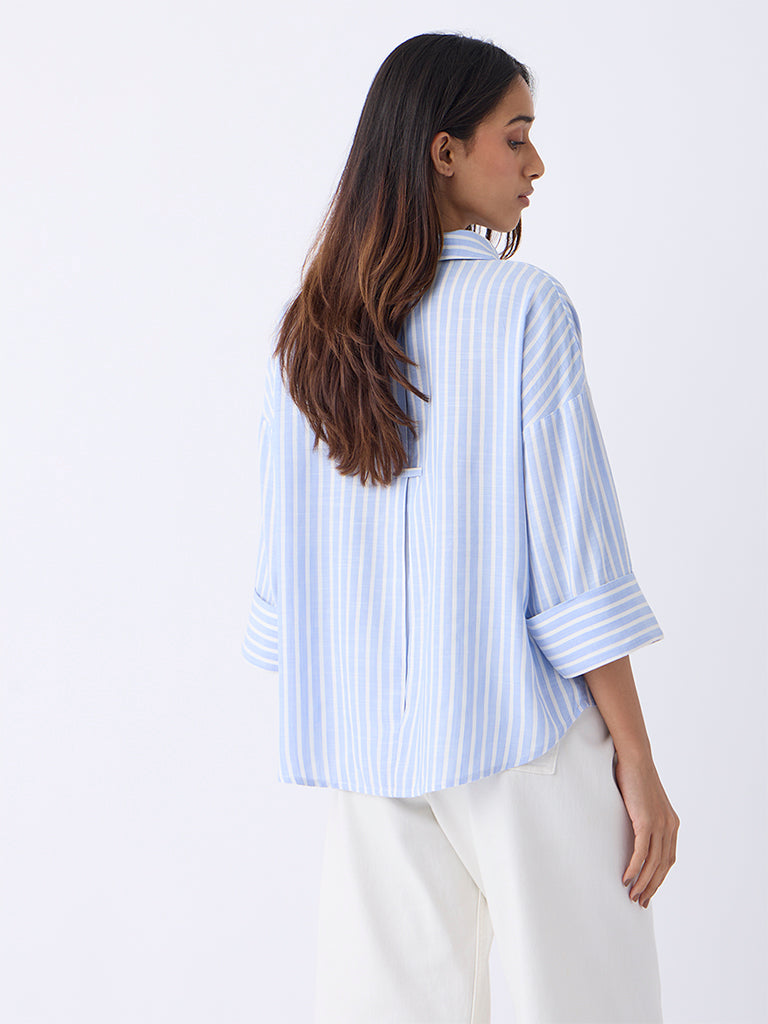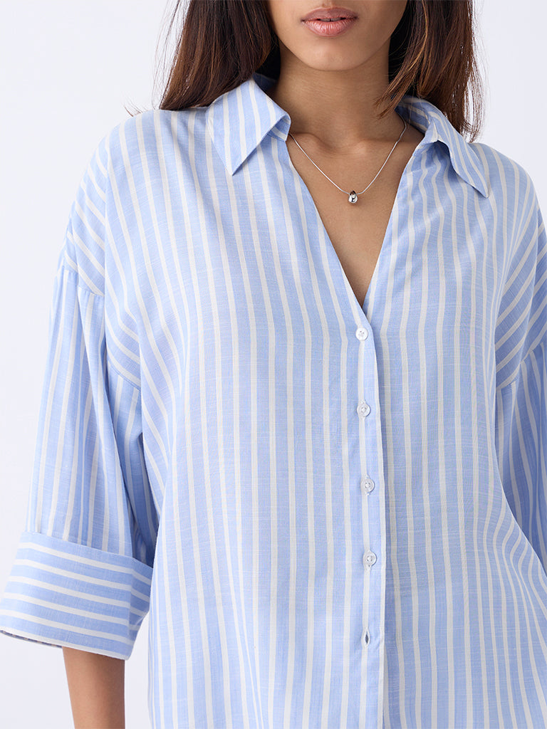 Add a fresh perspective to weekday dressing with this striped blue shirt from LOV. Milled from an airy fabric. it features a V-neck collar. button placket. and three-quarter sleeves. A versatile staple that works as well tucked into trousers as it does styled loose over denim.