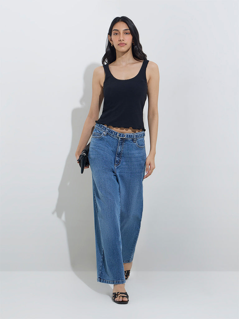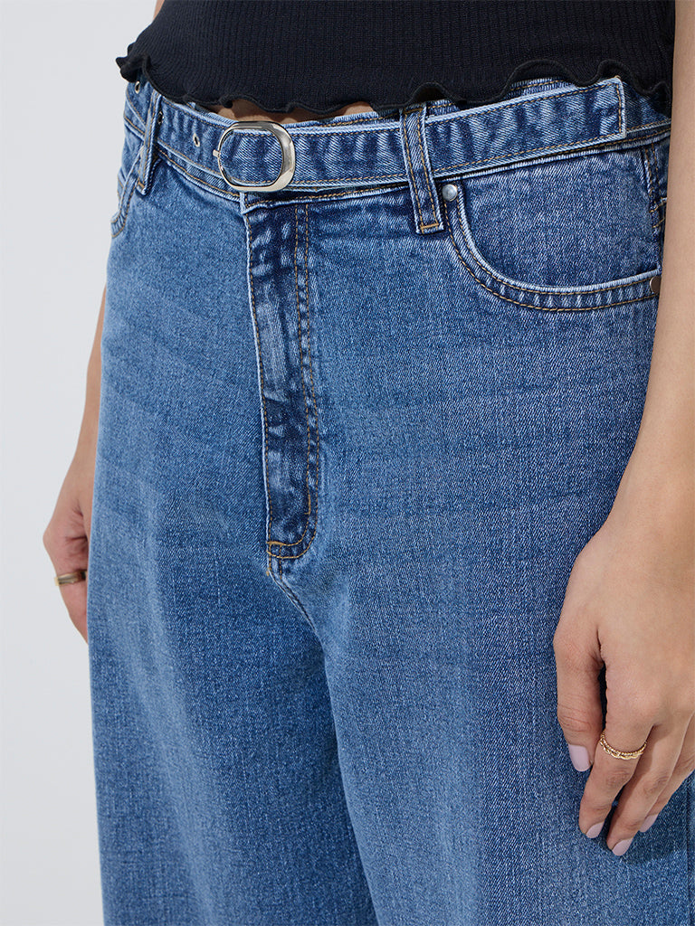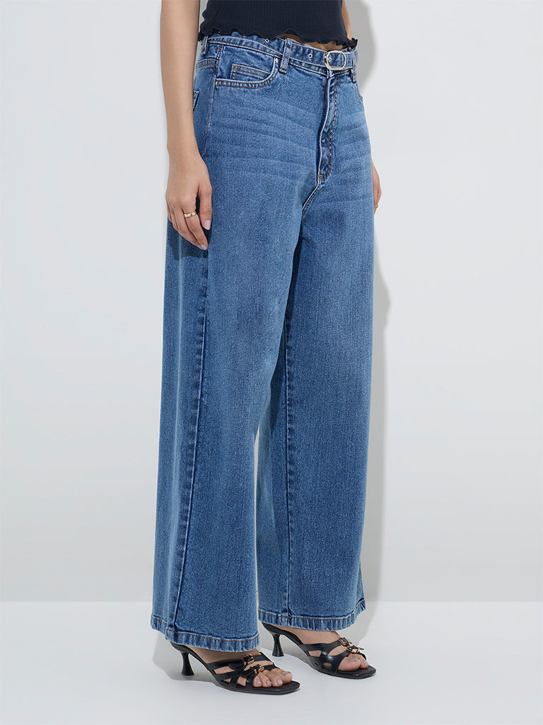 LOV introduces these wide-leg blue jeans. crafted from a sturdy cotton-blend fabric. Designed in a high-rise silhouette. they feature a buttoned waist. zipper fly. and belt loops for a classic touch. Multiple pockets add functionality. while the included buckled belt offers a secure and polished finish.
