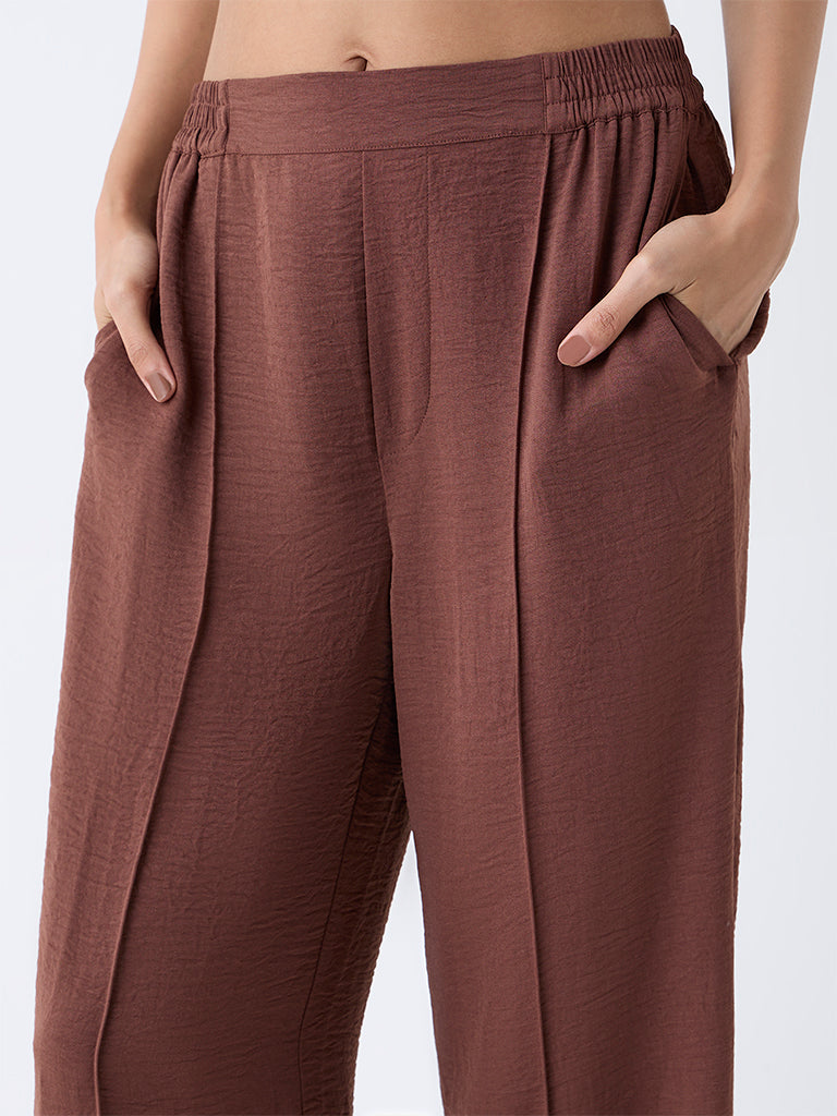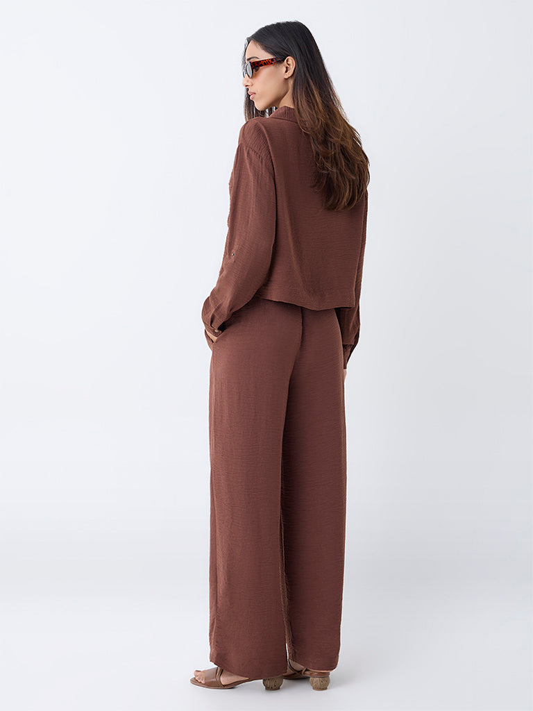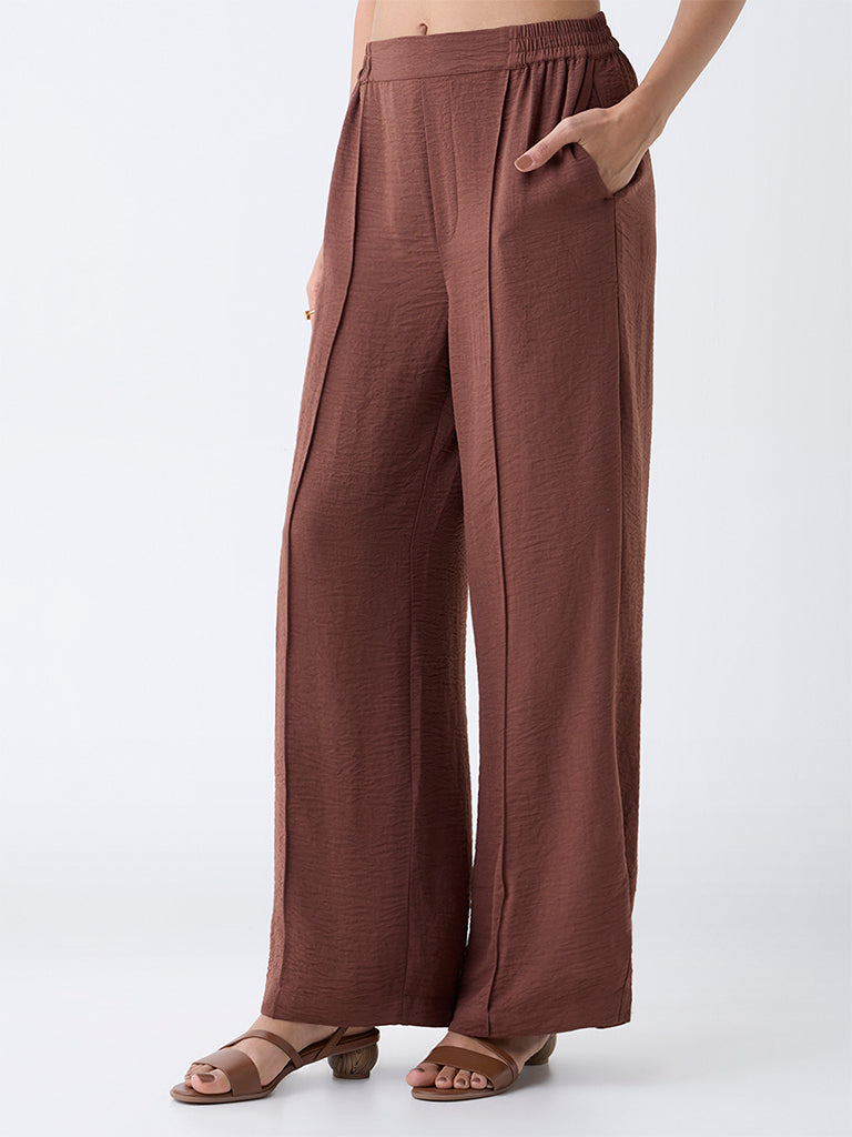 LOV Brown Crinkle-Textured High-Rise Trousers