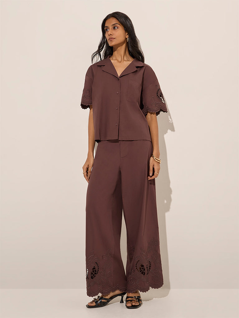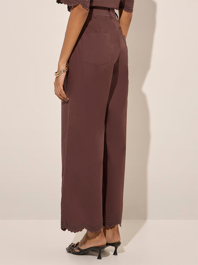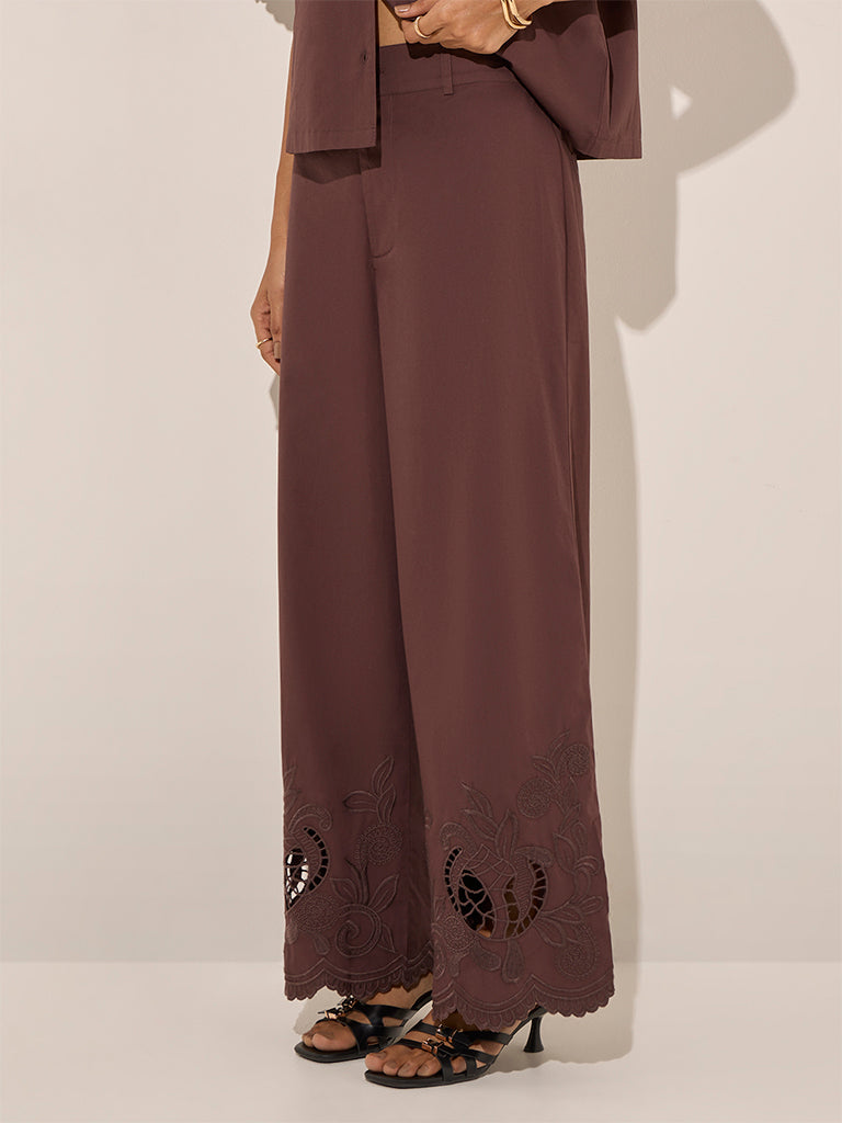 LOV Brown Cut-Out Detailed High-Rise Linen-Blend Trousers