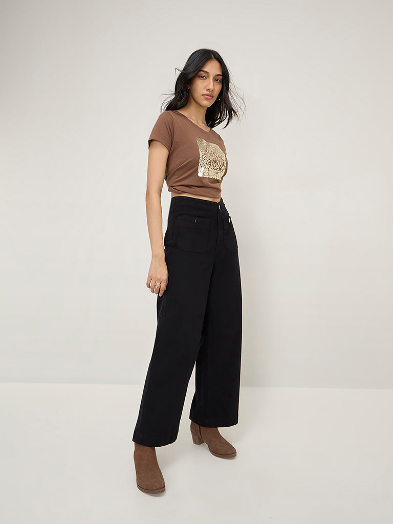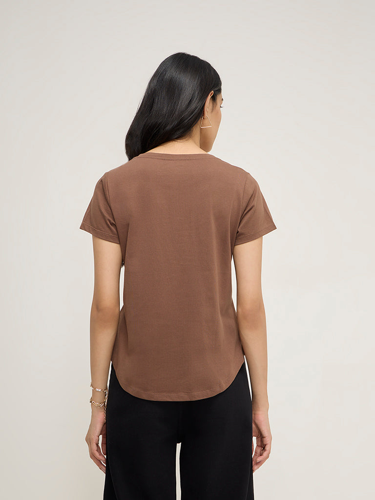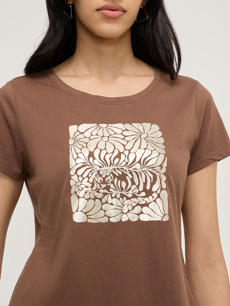 LOV presents this brown t-shirt adorned with gold-toned floral designs. Crafted from pure cotton. it is complete with a round neck and short sleeves.