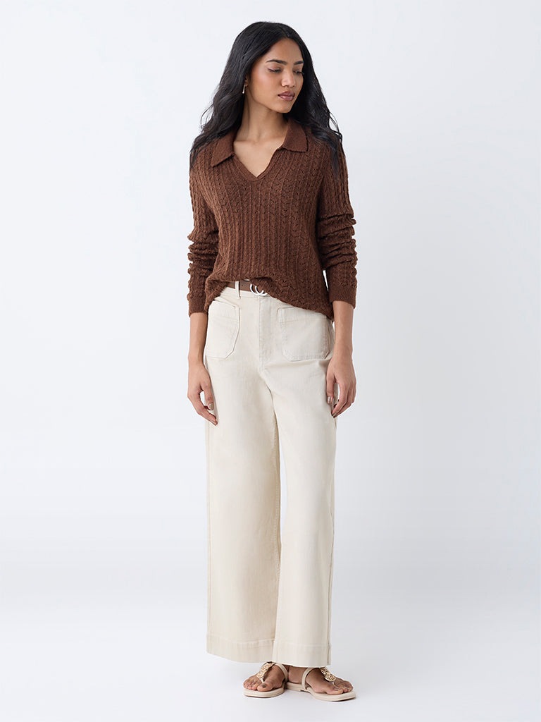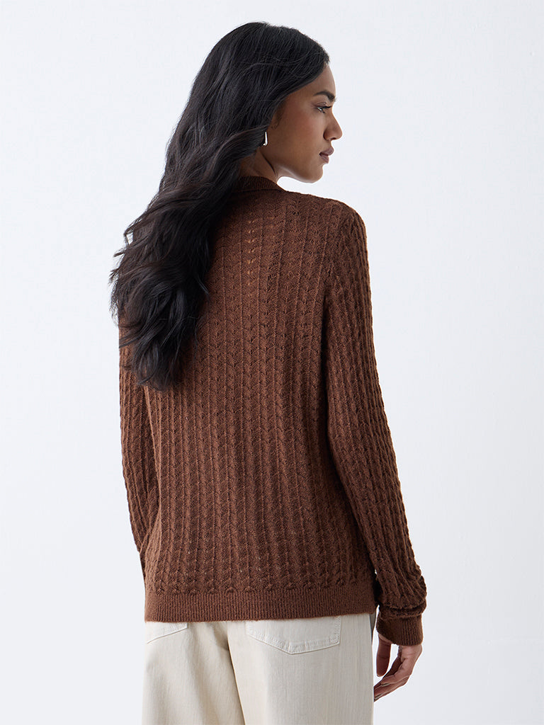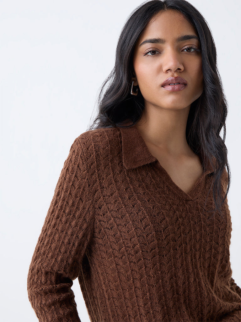 Autumn-ready and effortlessly chic. this brown sweater from LOV will become your go-to for layering this season. Woven from a knit-textured fabric. it offers cozy warmth while maintaining a refined drape. Featuring a V-neck collar and full sleeves. it strikes the perfect balance between relaxed comfort and polished style.