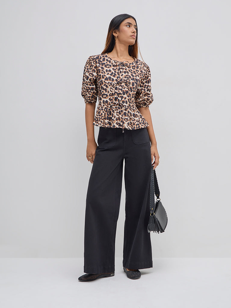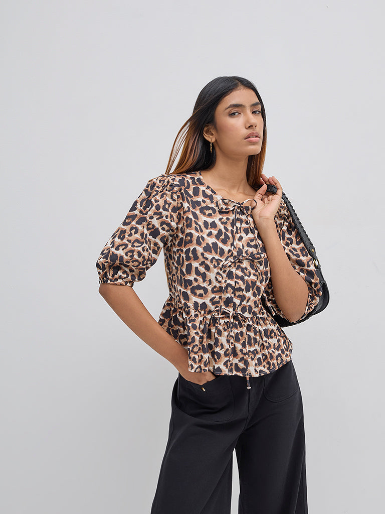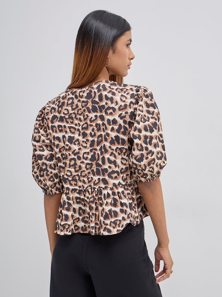 This brown peplum top by LOV is decked with leopard prints throughout. The pure cotton garment offers a comforting fit through its round neck and puffed sleeves.