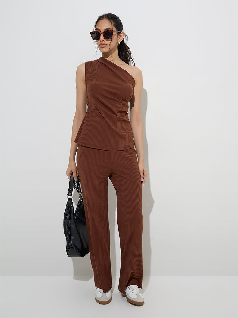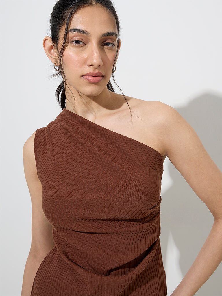 LOV Brown Ribbed One-Shoulder Cotton-Blend Top