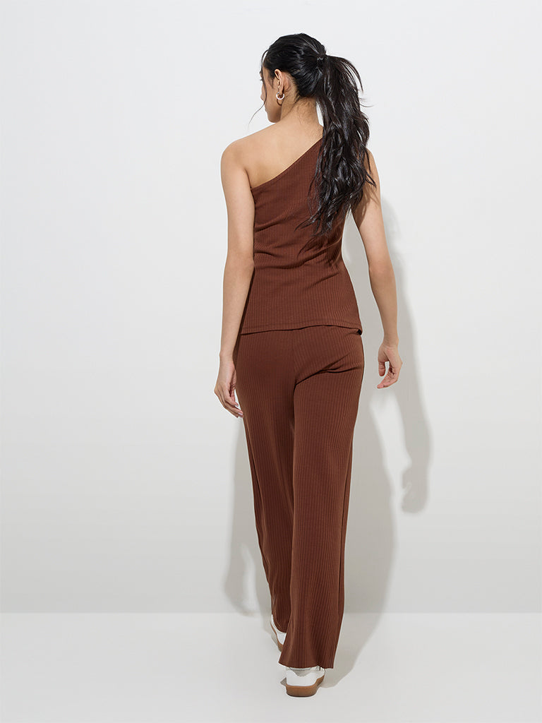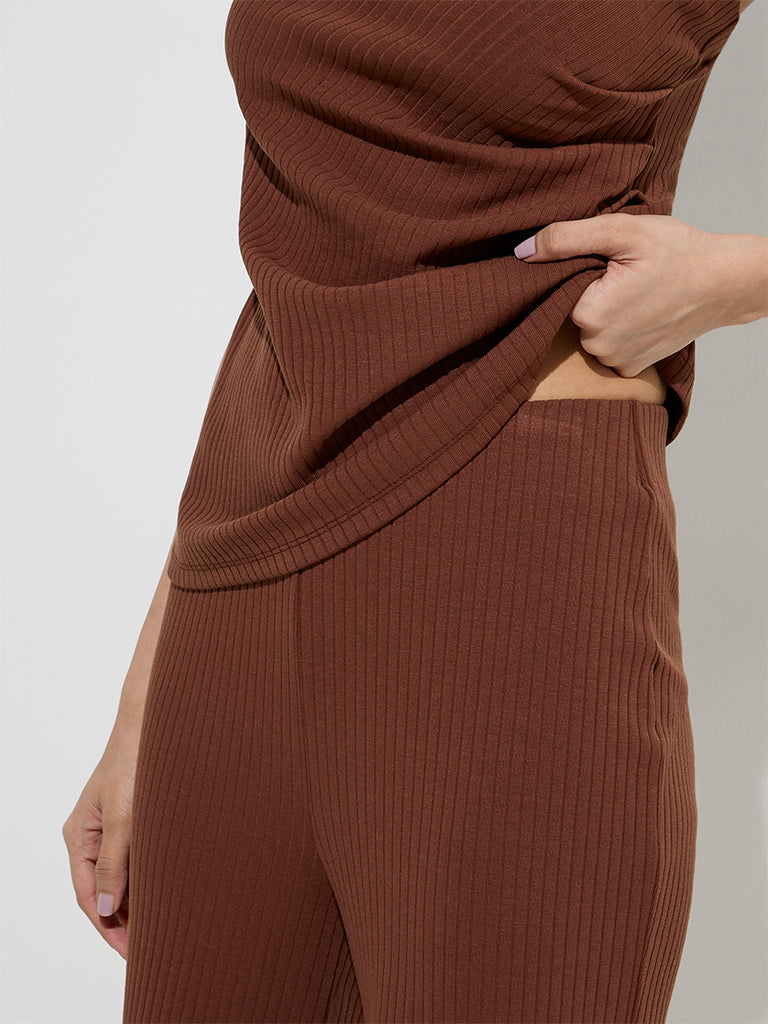 LOV Brown Ribbed-Textured Cotton-Blend High-Rise Pants
