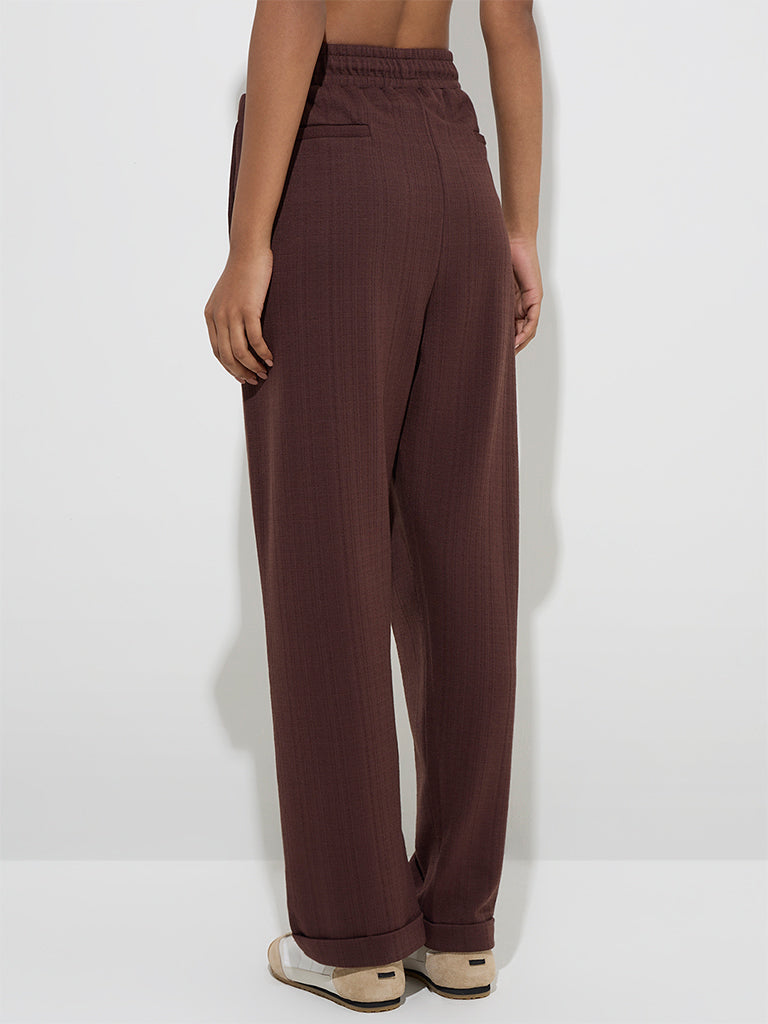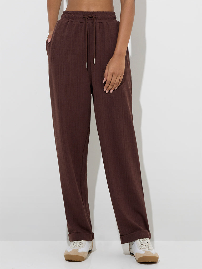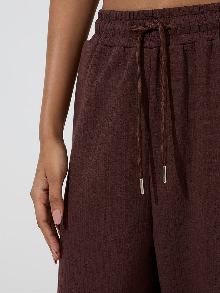 These brown pants from LOV are tailored from a rich cotton-blend fabric with a subtle self-textured finish. Featuring an elasticated drawstring waistband and multiple utility pockets. they strike the perfect balance between comfort and casual style for everyday wear.