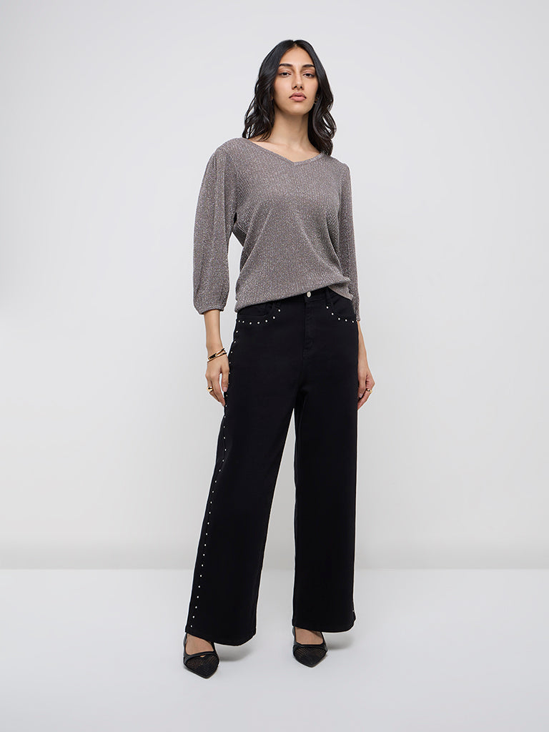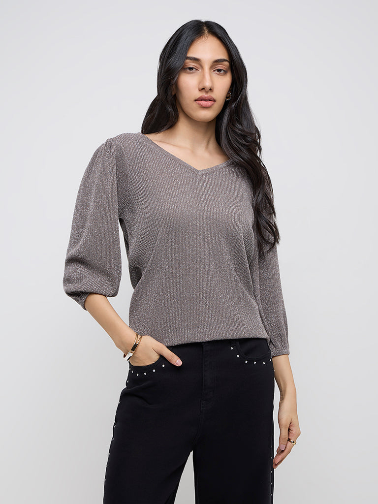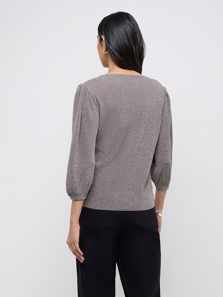 This brown sweater by LOV is crafted from a knitted fabric with a shimmering finish. It is designed with a V-neck and blouson sleeves.