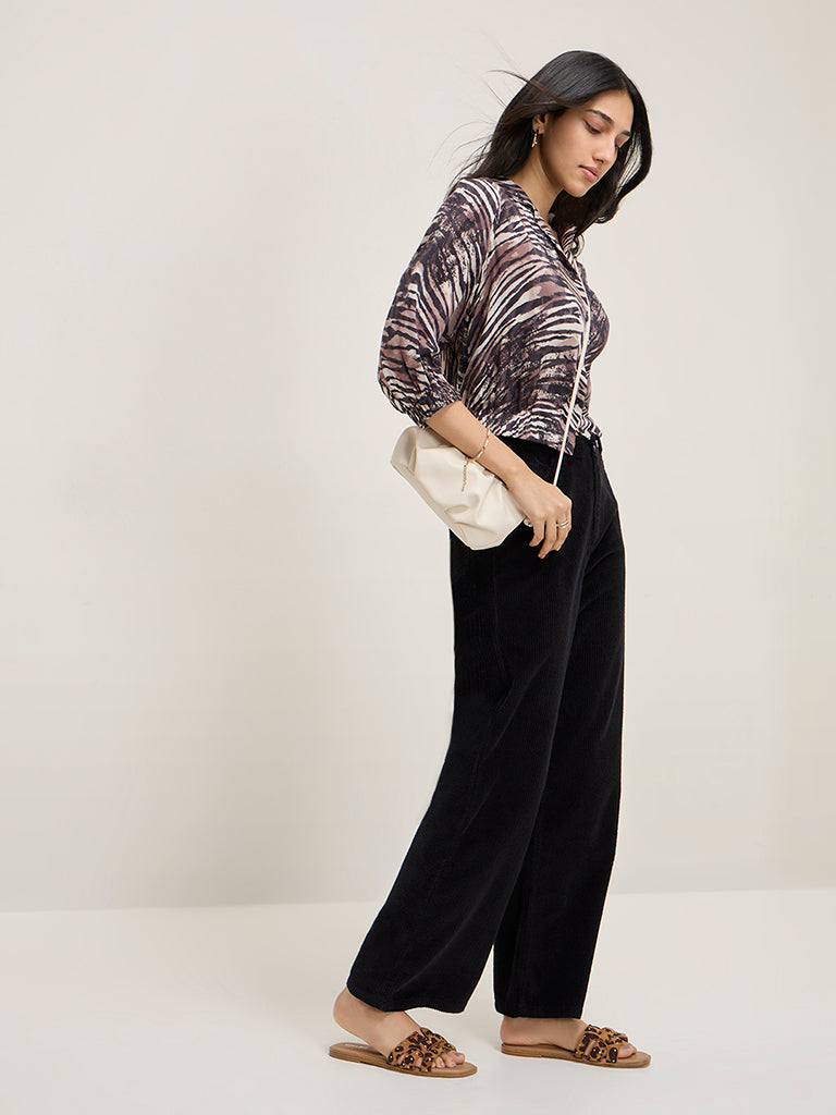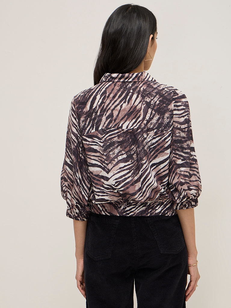 This burgundy shirt by LOV features animal print. Made with quality fabric. it offers a notched collar. full sleeves and a button down front. The elasticated waistband ensures a flattering fit.