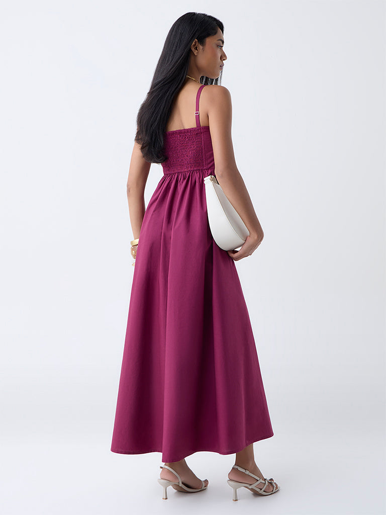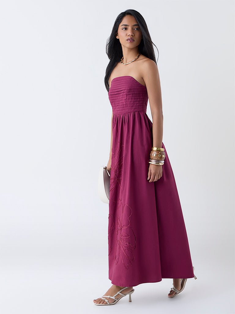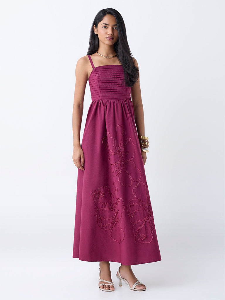 Exude effortless femininity with this burgundy dress by LOV. Woven from pure cotton. it is adorned with floral embroidery across the front. while a pintuck-detailed bodice creates a flattering silhouette. Complete with a square neck. smocked back. and detachable adjustable straps. it offers a versatile fit that combines comfort with style.