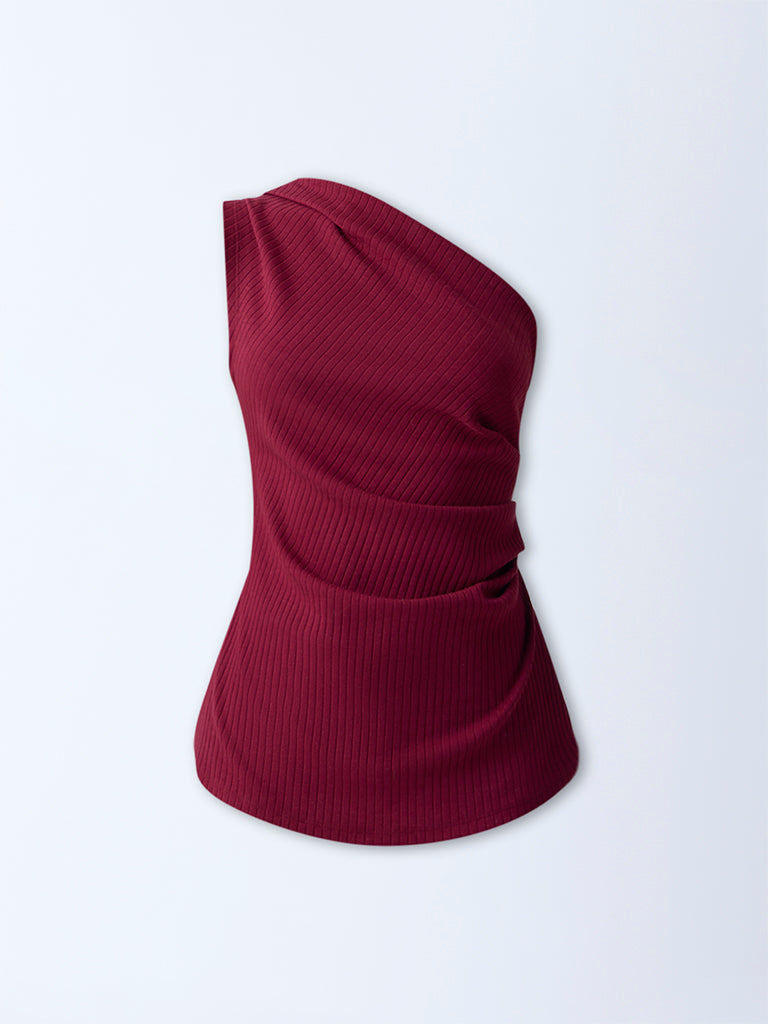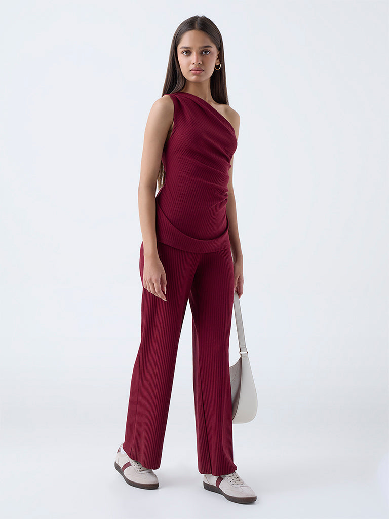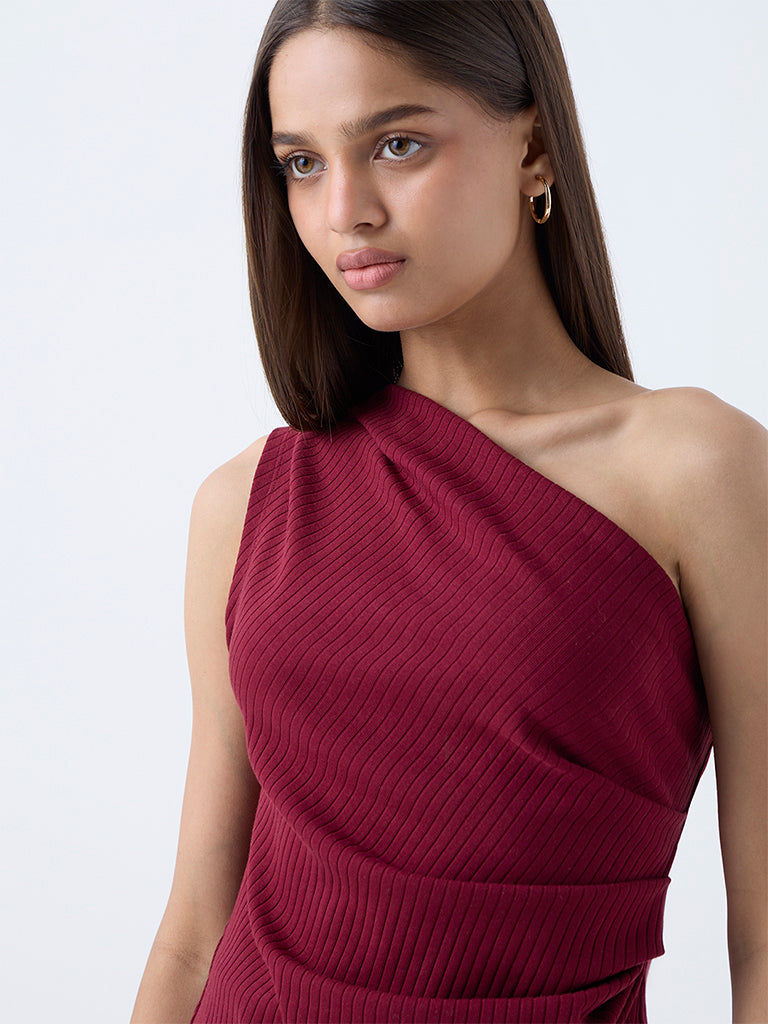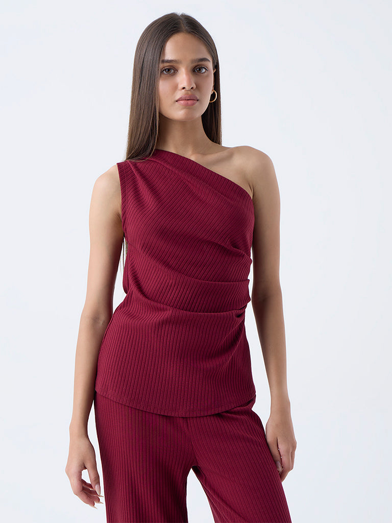Turn heads in this burgundy off-shoulder top from LOV. styled with a chic ruched design and a modern one-shoulder silhouette. Subtle self-striped detailing adds texture and depth. creating a standout piece perfect for casual outings or evening occasions.