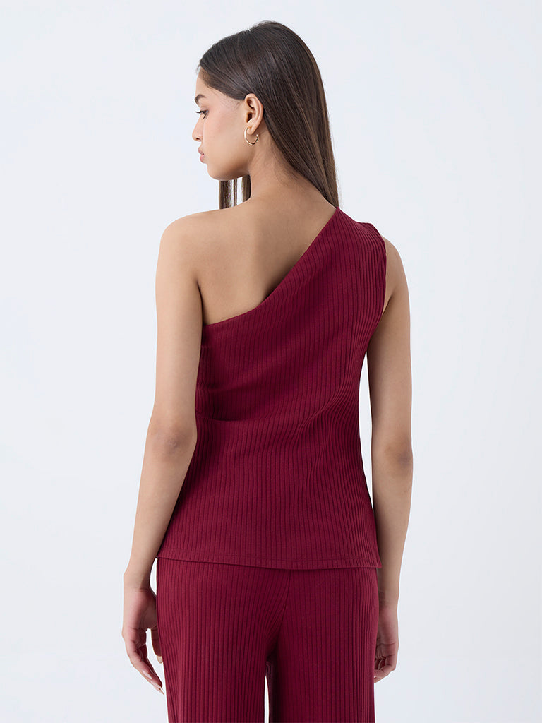 LOV Burgundy Self-Striped One-Shoulder Cotton- Blend Top