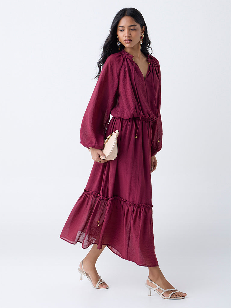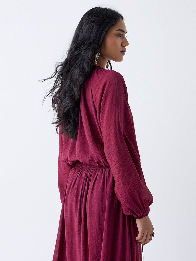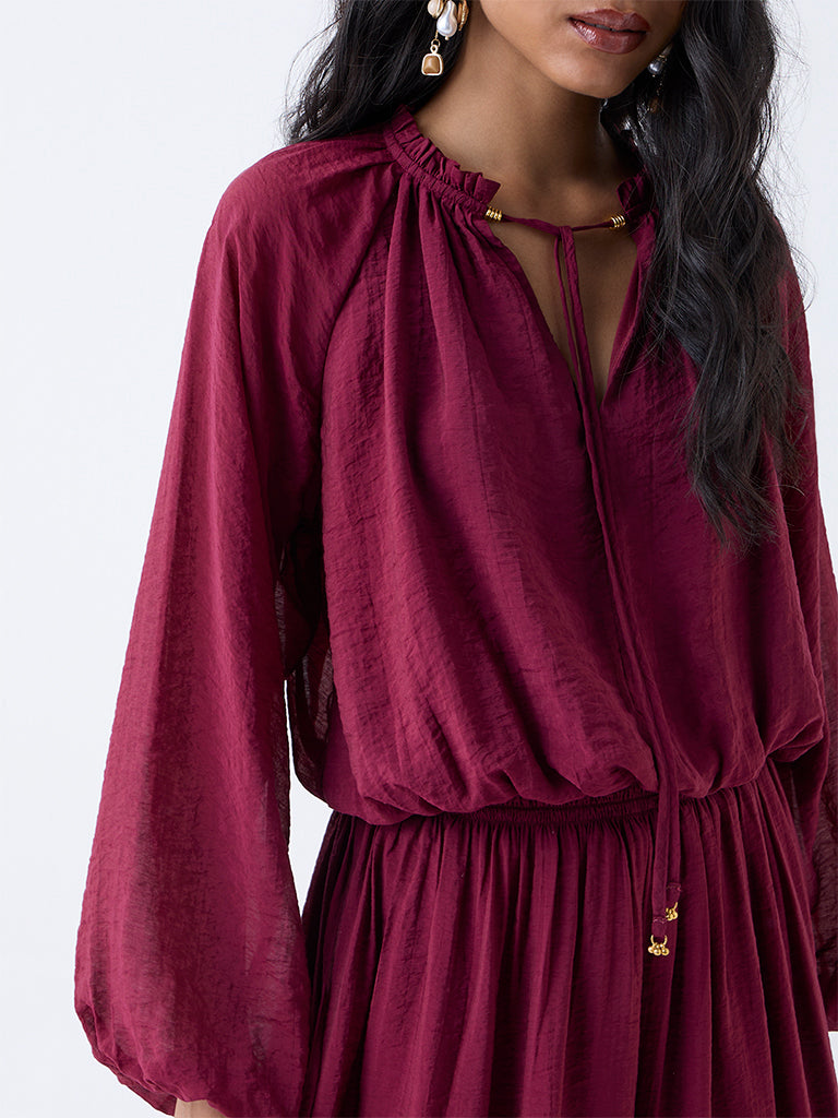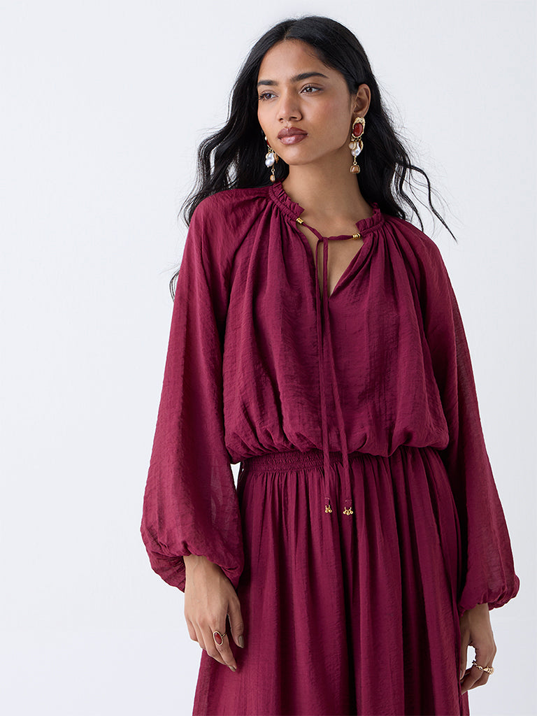 Say goodbye to wardrobe dilemmas with this burgundy top by LOV that instantly elevates any look. The crinkled fabric breathes with movement. while a ruched split neck with tie-up detail and balloon sleeves add personality that doesn’t compromise on comfort. An elasticated waistband sculpts subtly. so you feel poised whether running errands or meeting friends.
