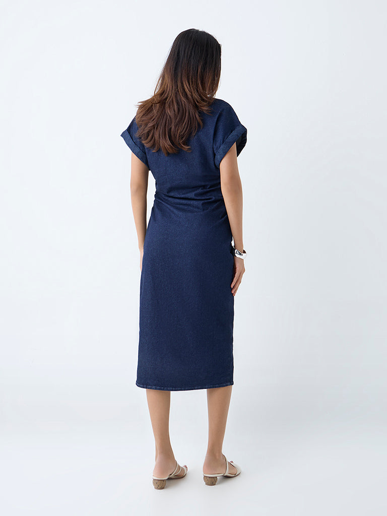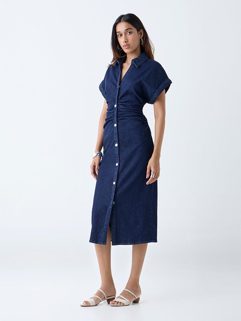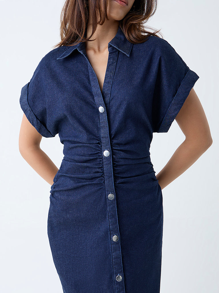 Make heads turn wearing this dark blue denim dress from LOV. Spun from a durable cotton-blend. the silhouette is defined by soft ruching at the waist for a naturally flattering shape. A tailored collar flows into a button placket. while upturned dolman sleeves lend a modern finish to this piece.