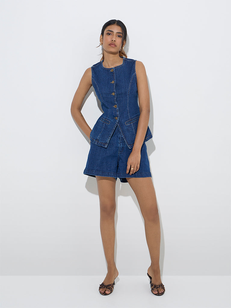 This dark blue waistcoat-style denim top from LOV is a sleek blend of structure and style. Crafted from a cotton-blend fabric. it features a round neckline. button-up front. and a sleeveless profile for a modern edge. Functional front pockets add a touch of utility.