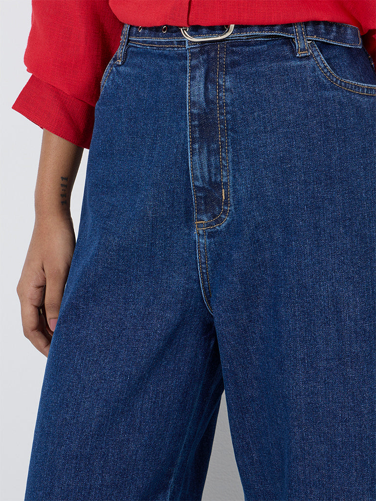 These dark blue jeans from LOV are fashioned in a wide-leg fit silhouette. Milled from a cotton-blend fabric. the high-rise pair is fitted with a buttoned waistband. zipper-fly. belt loops. and multiple pockets. The buckled belt ensures a secure fit.