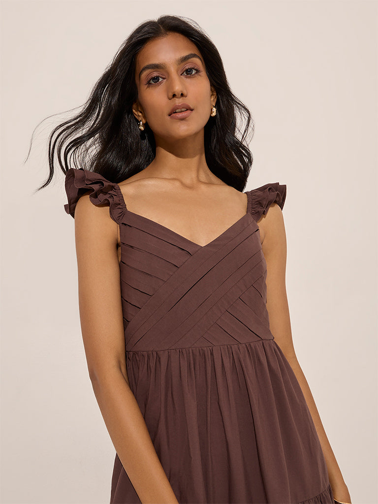 LOV launches this dark brown dress featuring self-striped bodice leading to a graceful A-line silhouette. Made with quality fabric. it is designed with tiered design and cut-out detailing offering a sophisticated finish. The garment is structured with a V-neck and butterfly sleeves.