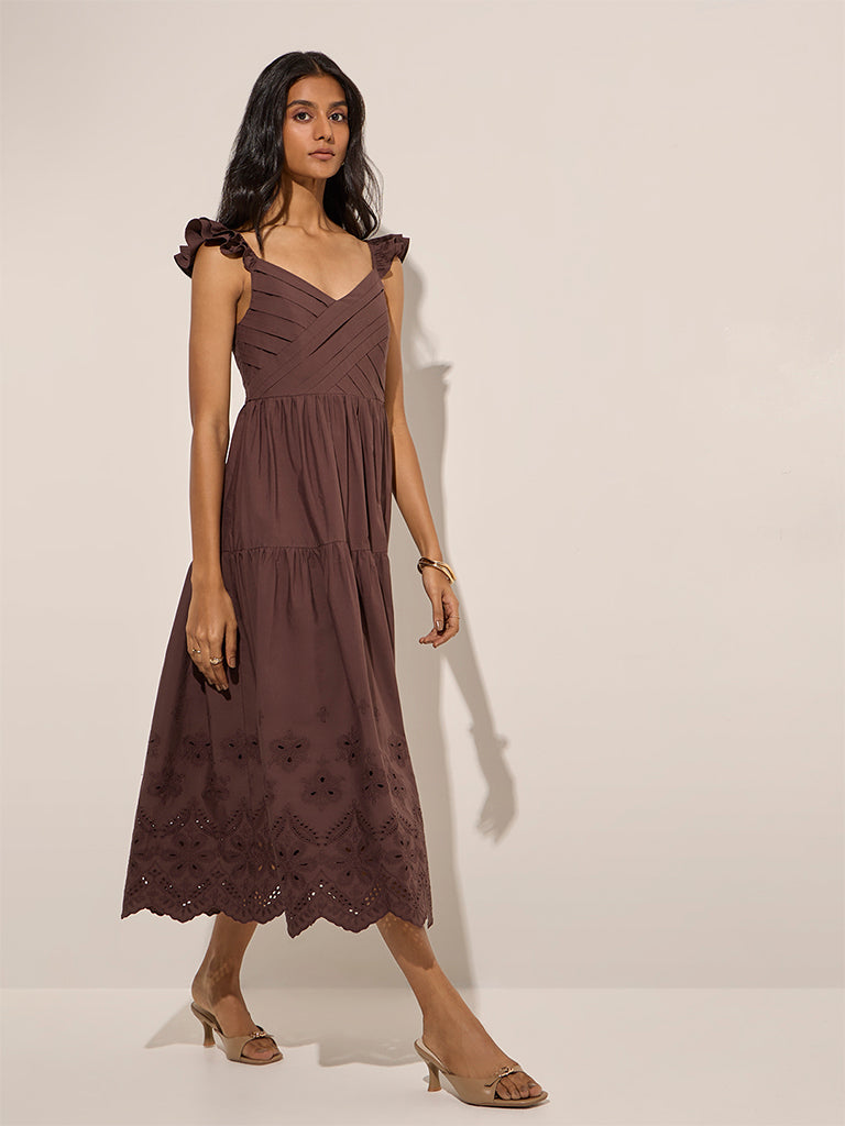 LOV Dark Brown Cut-Out Detailed A-Line Cotton Dress