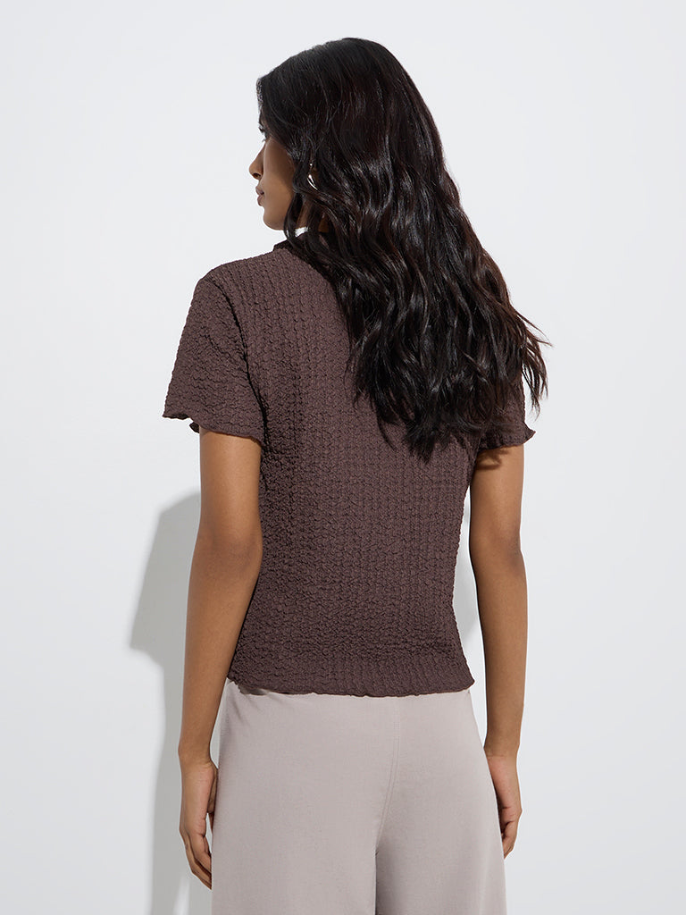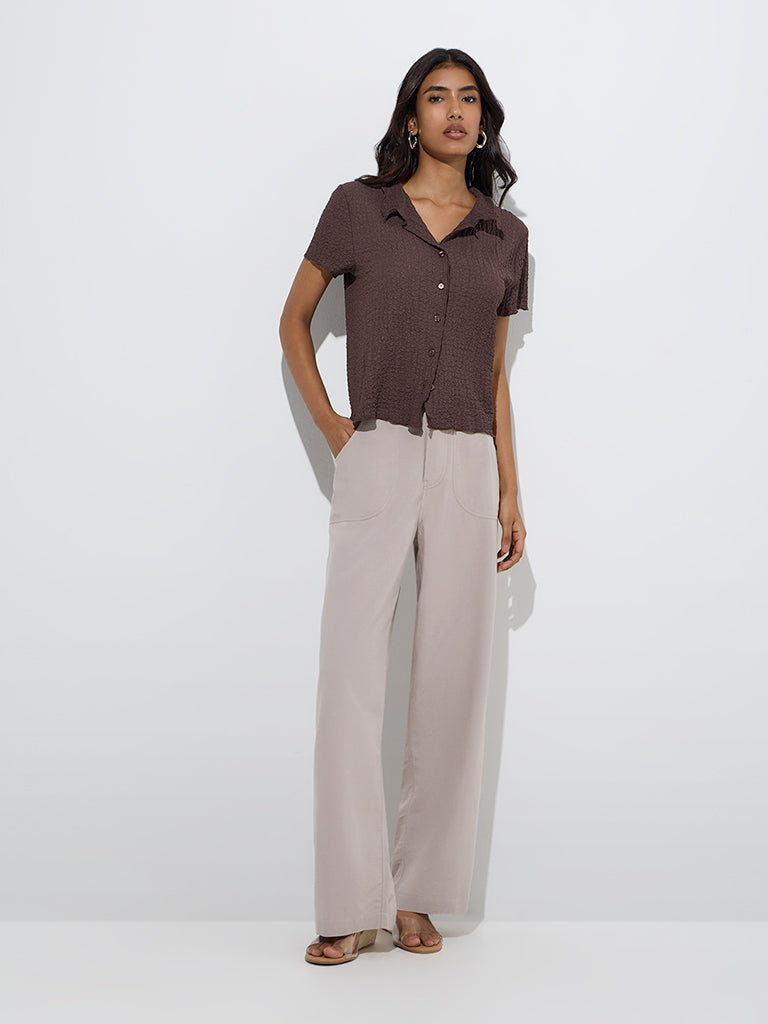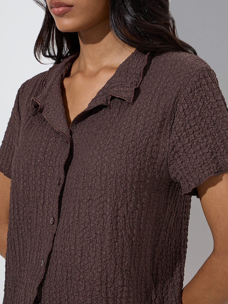 This dark brown shirt from LOV is spun from a self-textured fabric that ensures day-long comfort. Framed with a notched collar and short sleeves. it’s styled with a button placket and finished with a scalloped hem for an understated yet elevated touch.