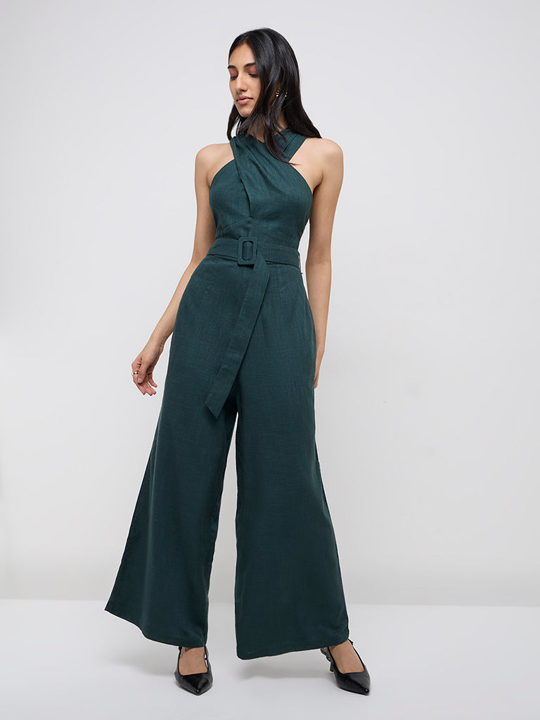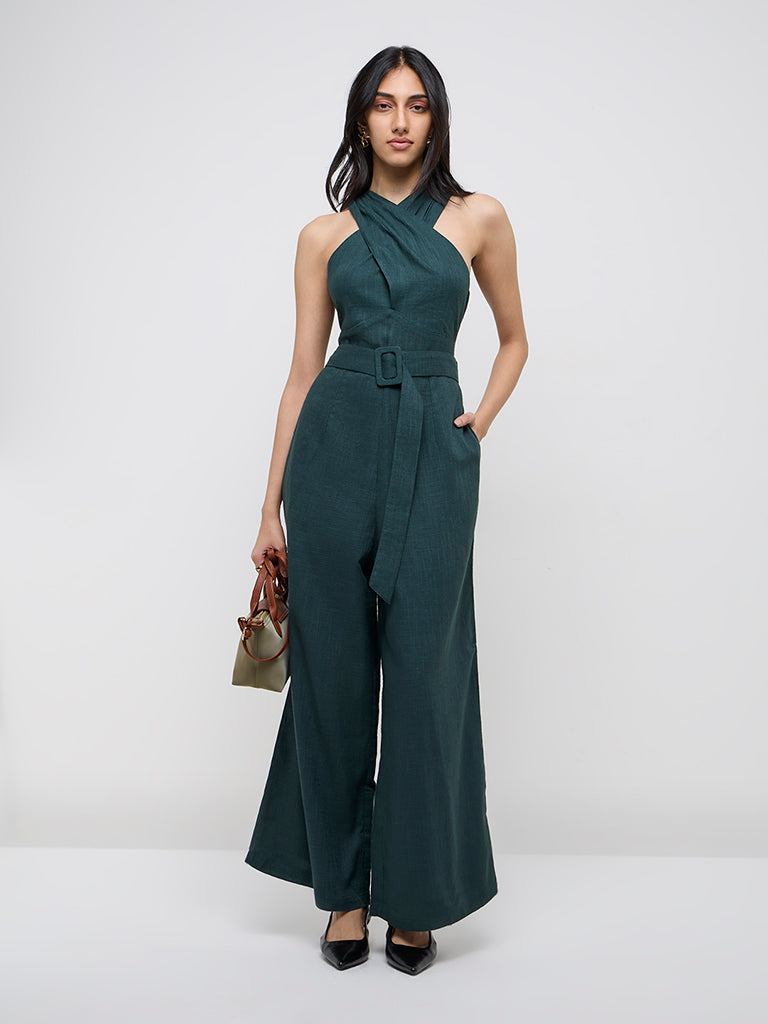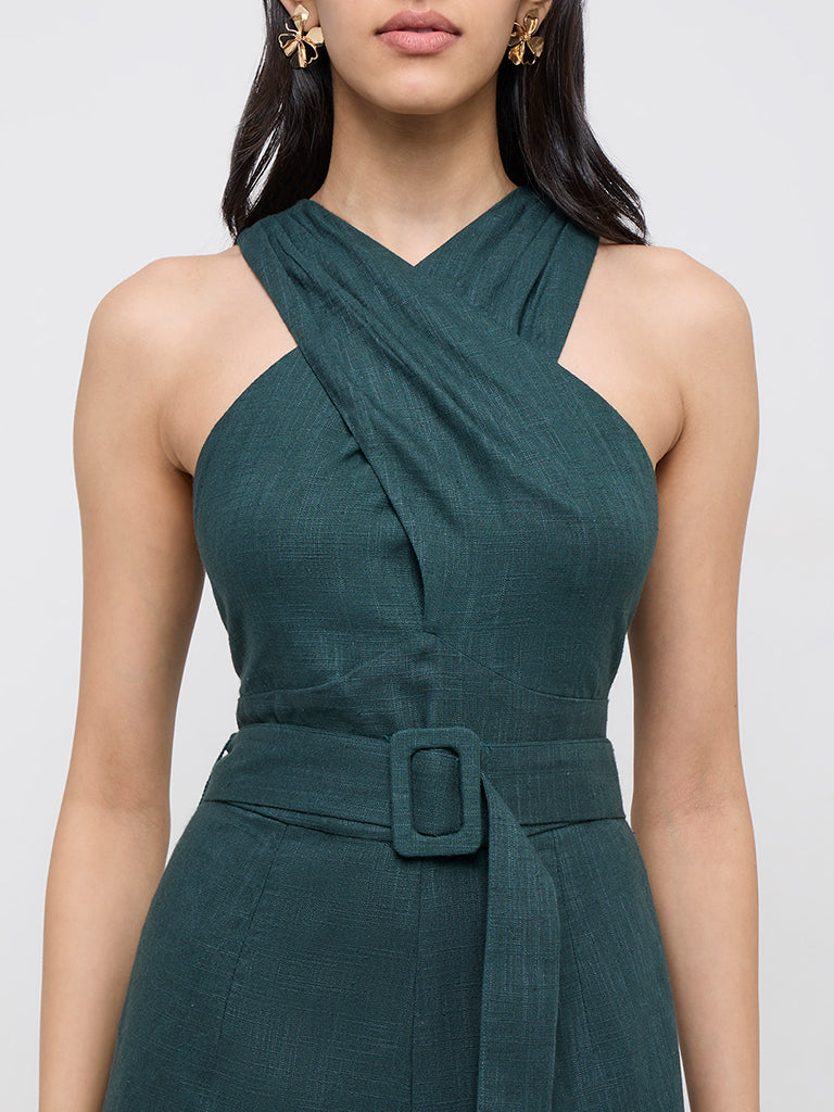 This dark green jumpsuit from LOV will make a statement. Crafted from a linen-blend fabric. it is designed with a criss-cross neckline and sleeveless cut. The matching belt ensures a flattering fit.