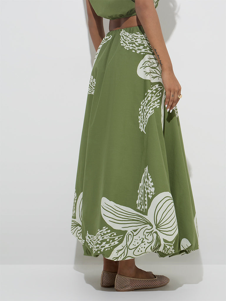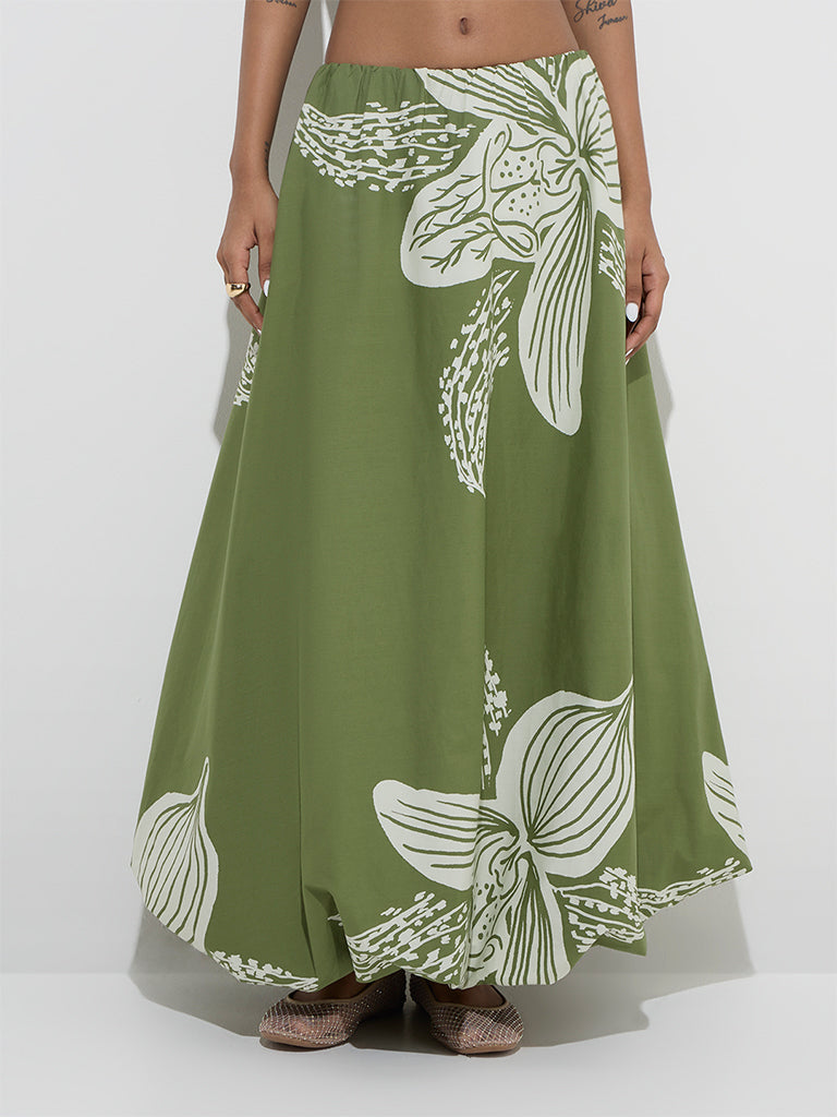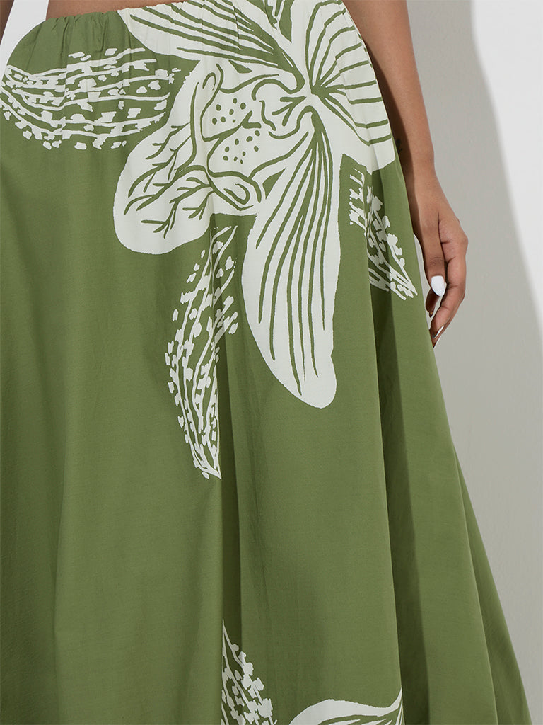 LOV Green Botanical Pattern Mid-Rise Cotton Skirt