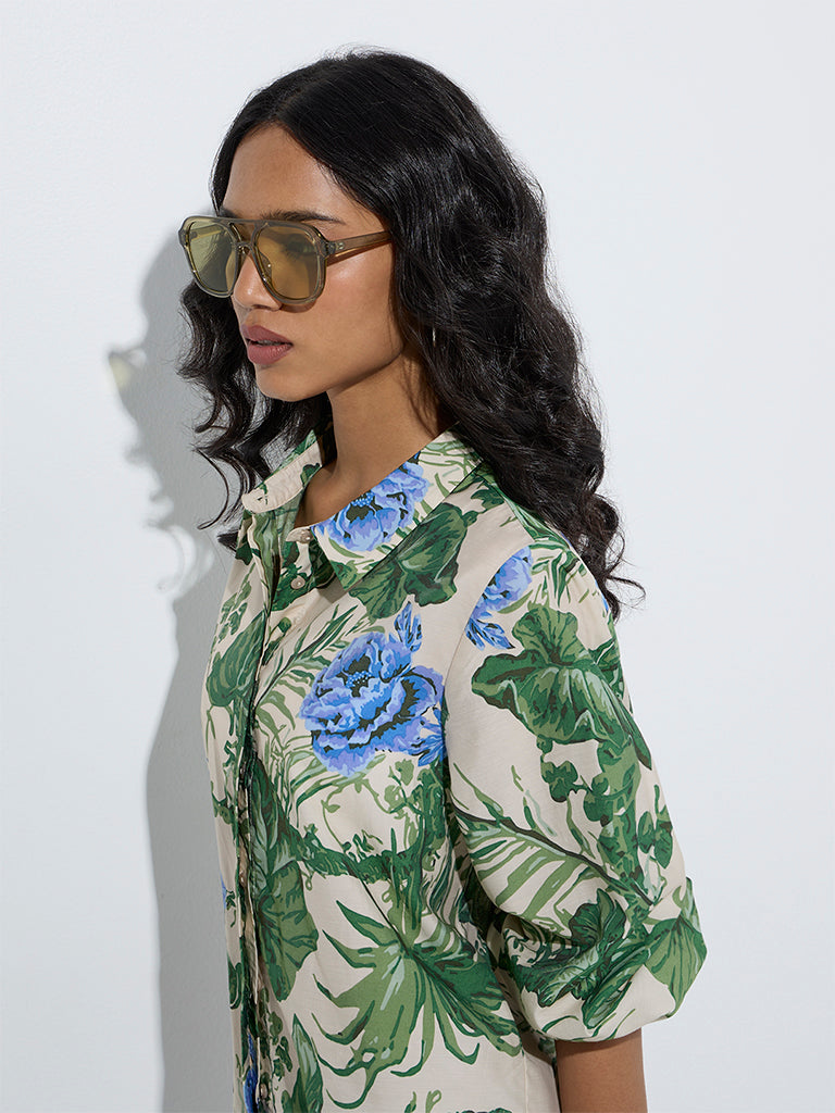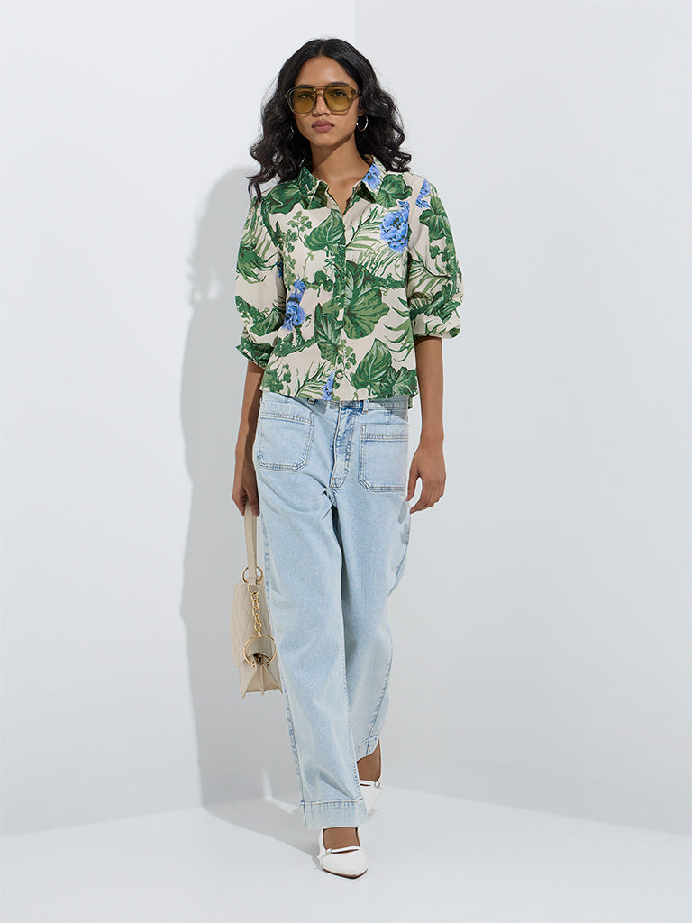 This green shirt from LOV showcases bold botanical prints for a vibrant touch. Woven from an ultra-lightweight fabric. it features a straight-point collar. a button placket. and peasant sleeves for a relaxed yet refined silhouette.