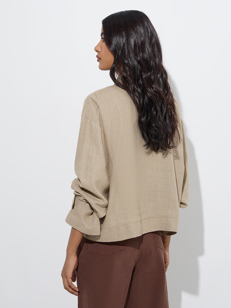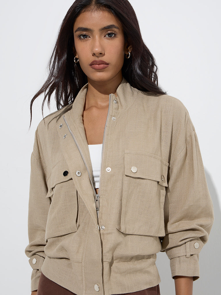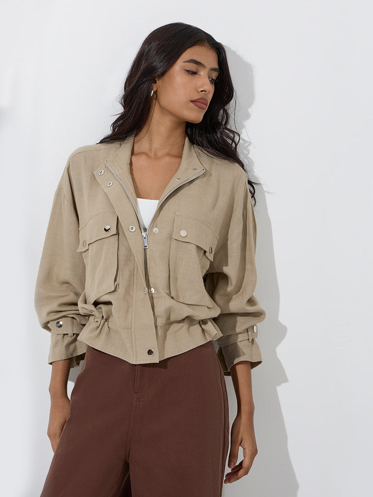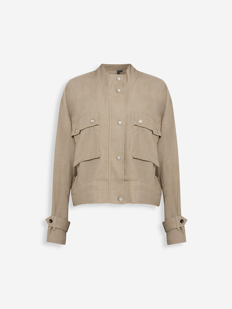 Perfect for layering. this khaki jacket from LOV is a standout addition to cooler-day wardrobes. It features a polished structure with a high neck. snap-button and zipper fastening. and full sleeves. Two front patch pockets complete the design with practical style.