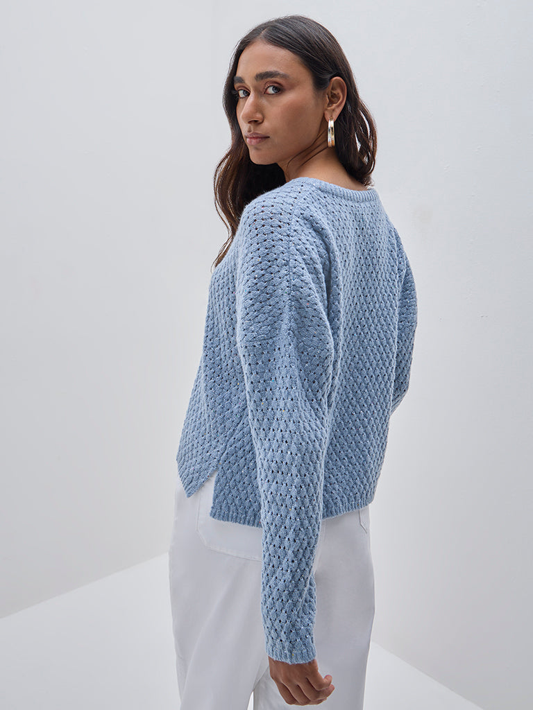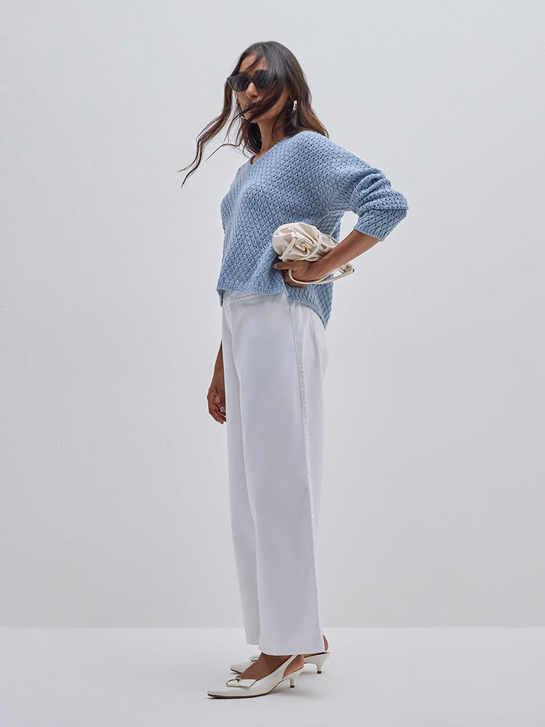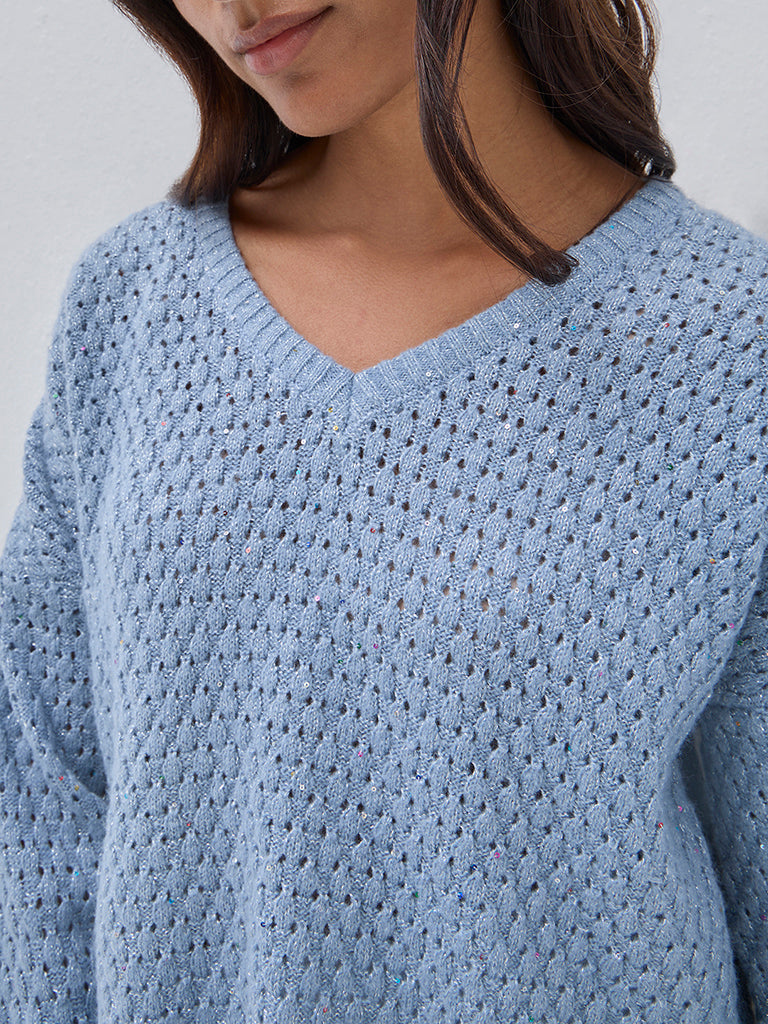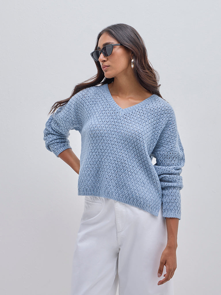 This light blue sweater from LOV is crafted from a knitted fabric with a V-neck and dropped sleeves. Pair it with white pants for a complete ensemble.
