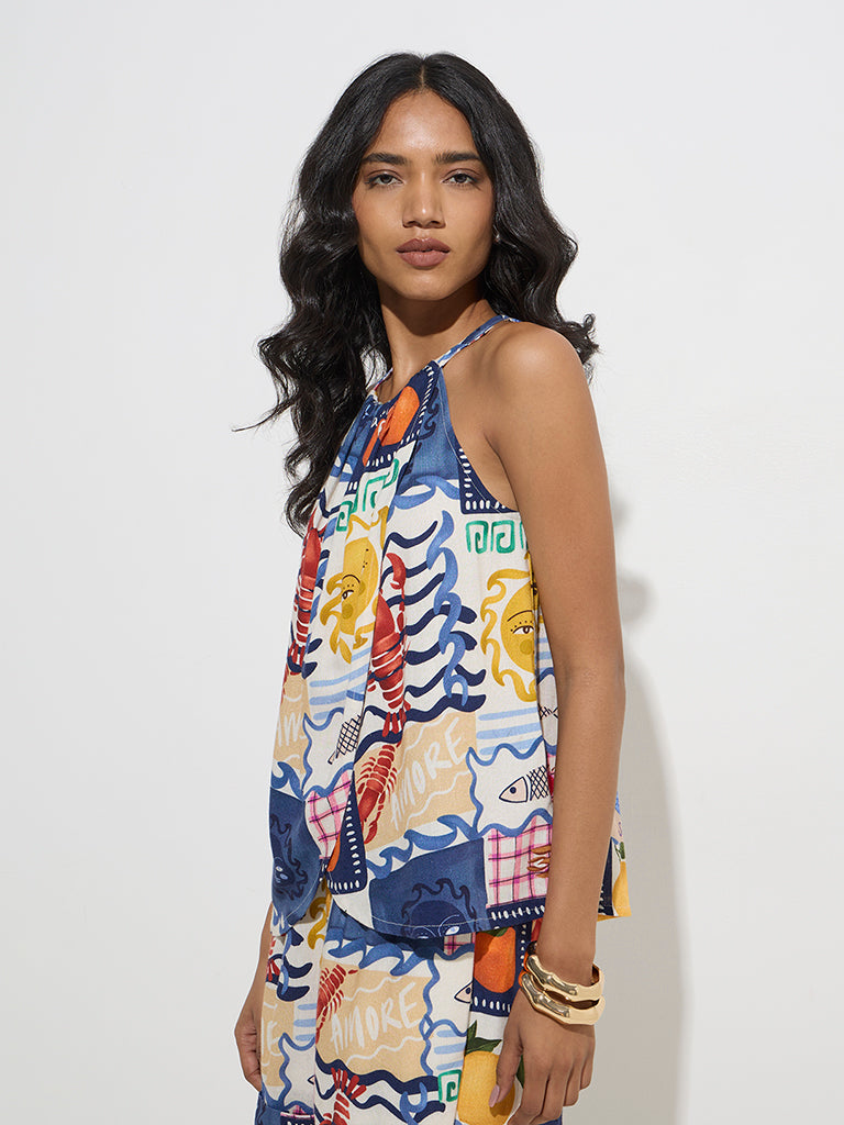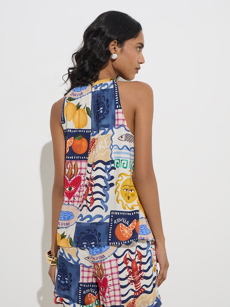 This multicolour top from LOV is defined by its overlapping front panel that drapes effortlessly for a feminine silhouette. Created from a premium cotton-blend fabric. it showcases vibrant abstract motifs that add a playful edge. The round neck and sleeveless design make it a breezy pick for sunny days.