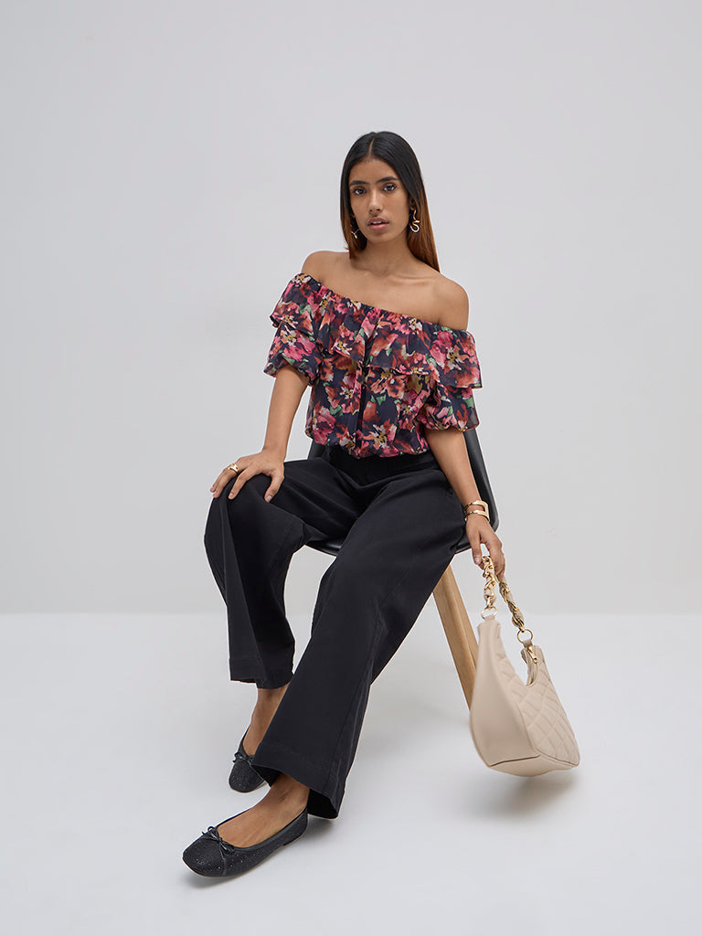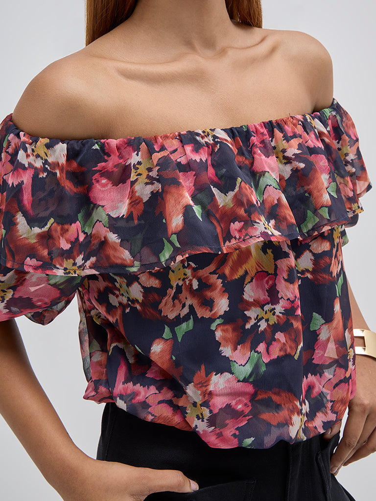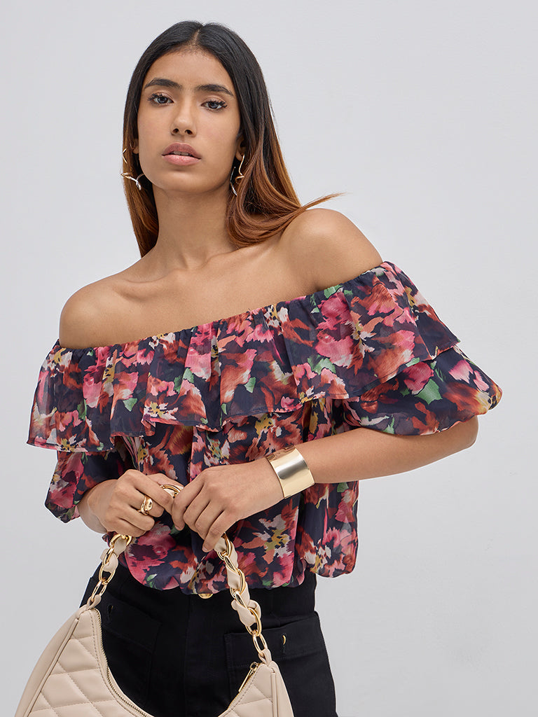 This multicolour top from LOV showcases floral prints. Spun from a lightweight fabric. it features an off-shoulder neckline coupled with ruffle detailing for added style.