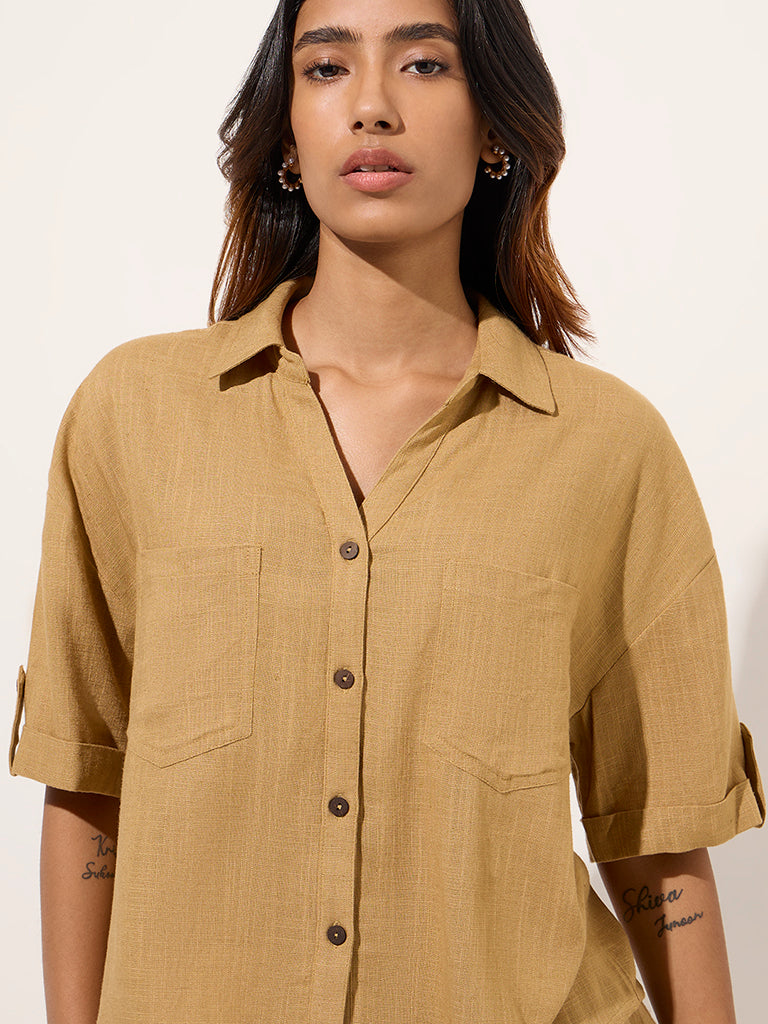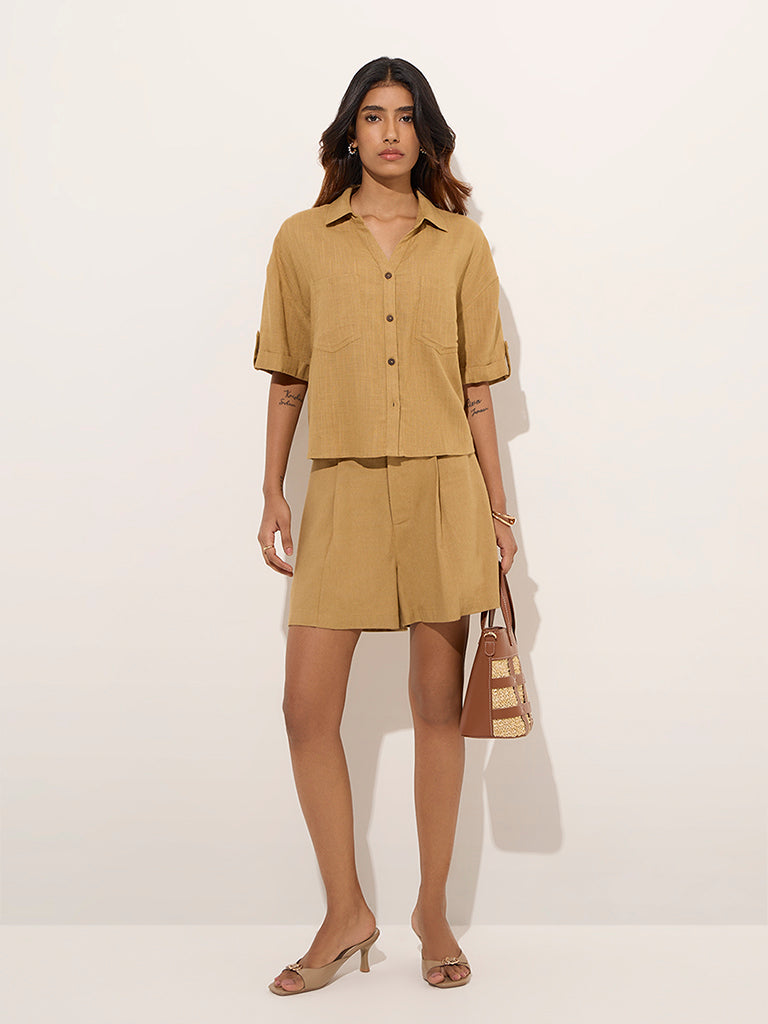 LOV presents this mustard solid shirt in a breathable fabric build. The garment is structured with a notched collar. button down style. half sleeves and two front pockets.