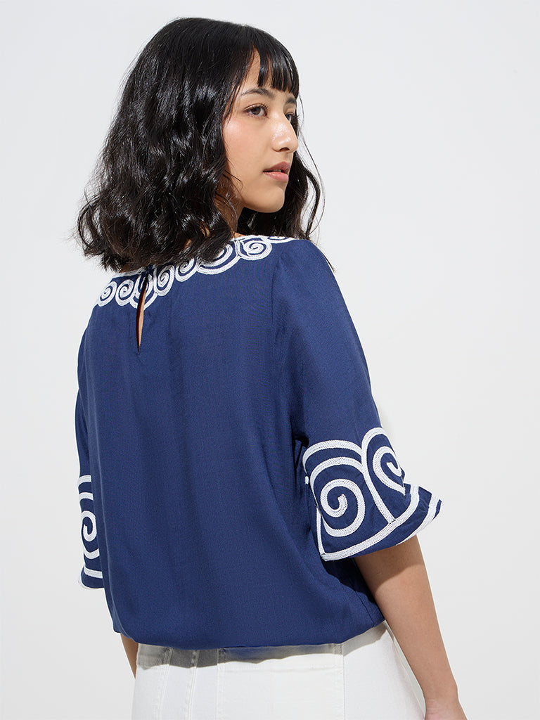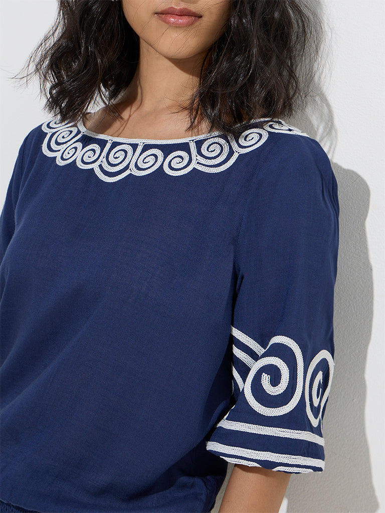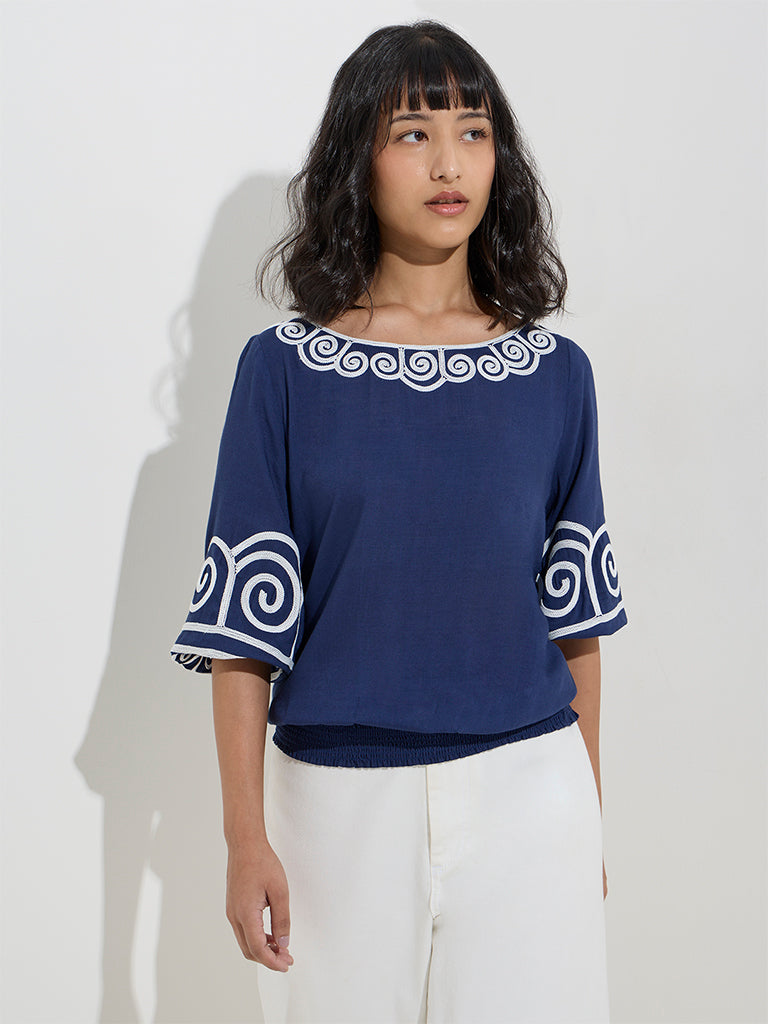 This navy top from LOV is adorned with delicate embroidery. adding an artistic touch. Milled from a breathable fabric. it features a chic boat neck and three-quarter sleeves for an effortlessly elegant look. The elasticated waistband lends a flattering fit.