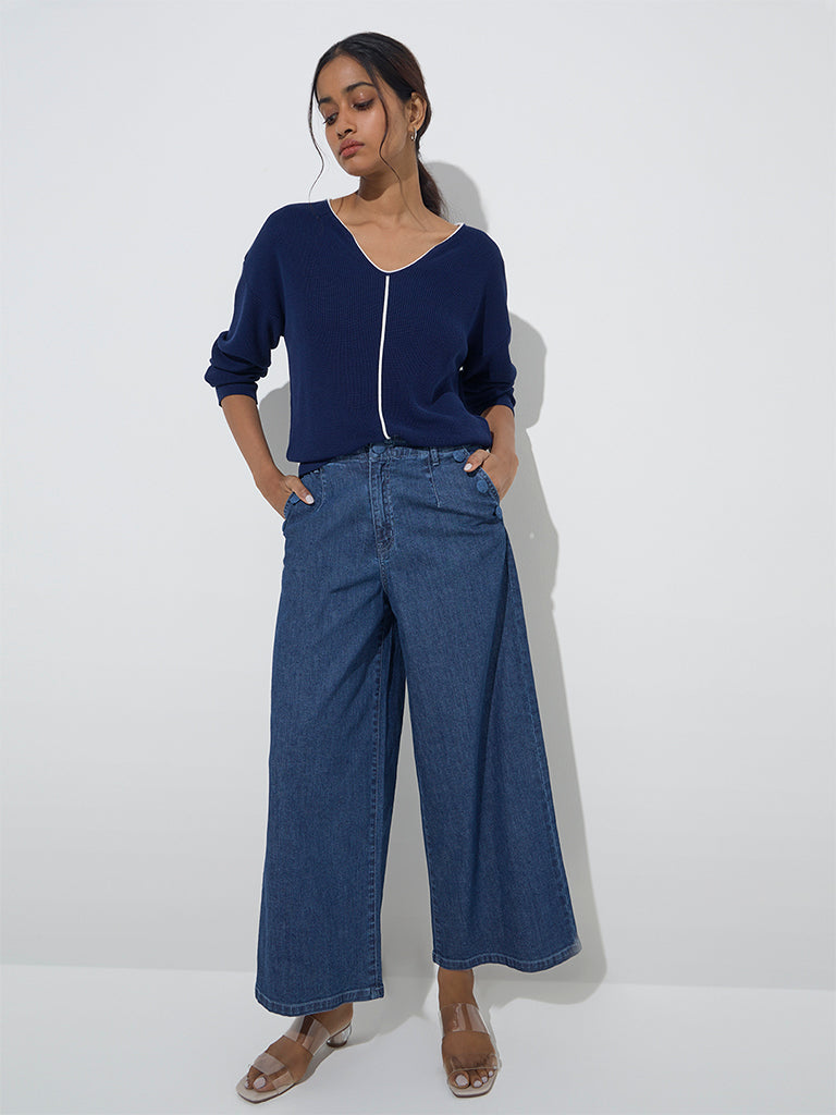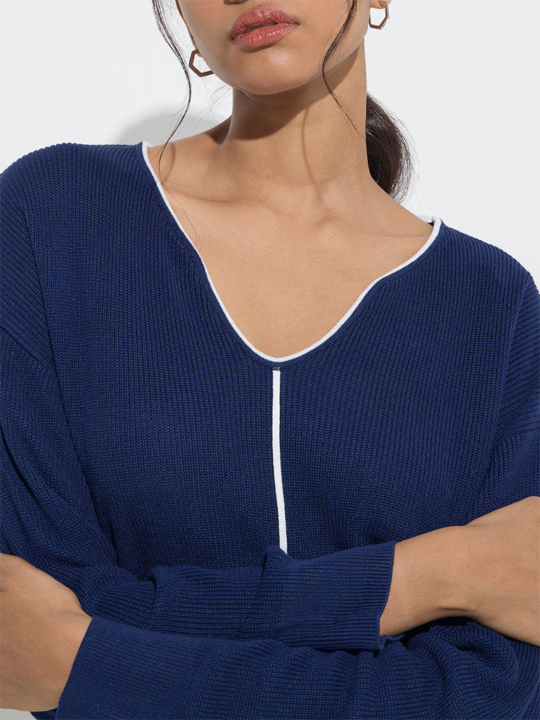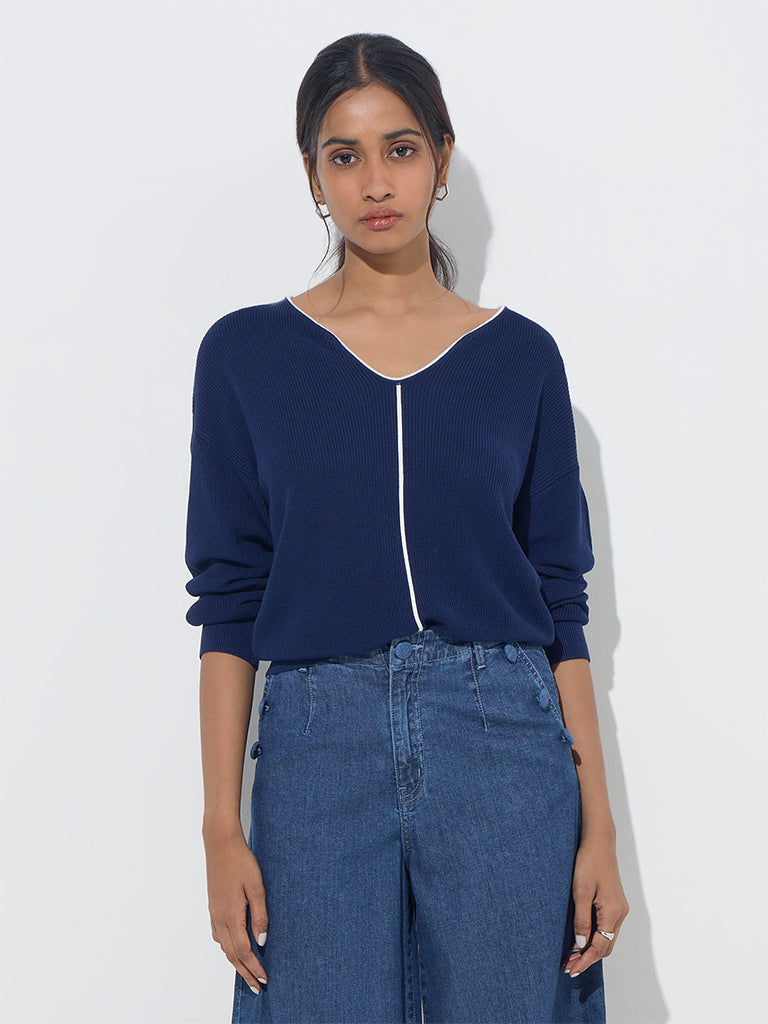 Spun from a ribbed-textured fabric. this navy top from LOV is complete with a V-neck and dropped sleeves.