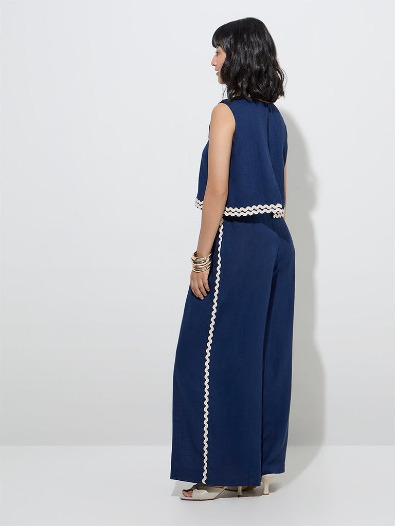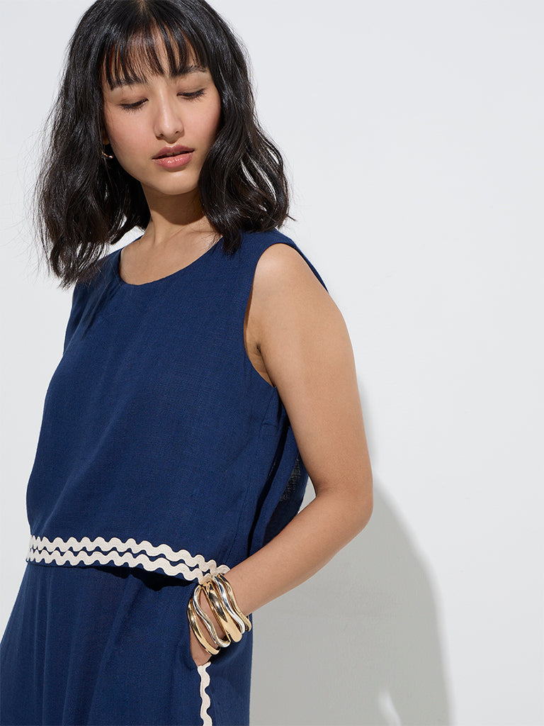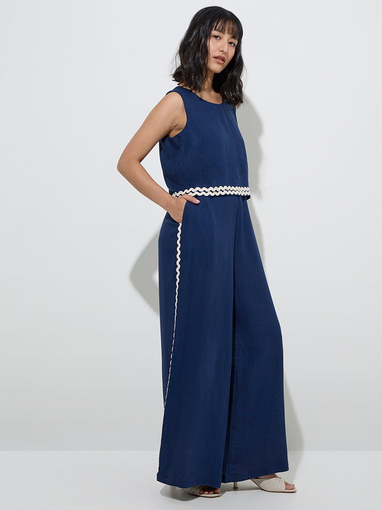 This navy jumpsuit from LOV is constructed from a sumptuous linen-blend fabric and accented with contrast detailing for a refined touch. The round neckline and sleeveless cut complete the design.