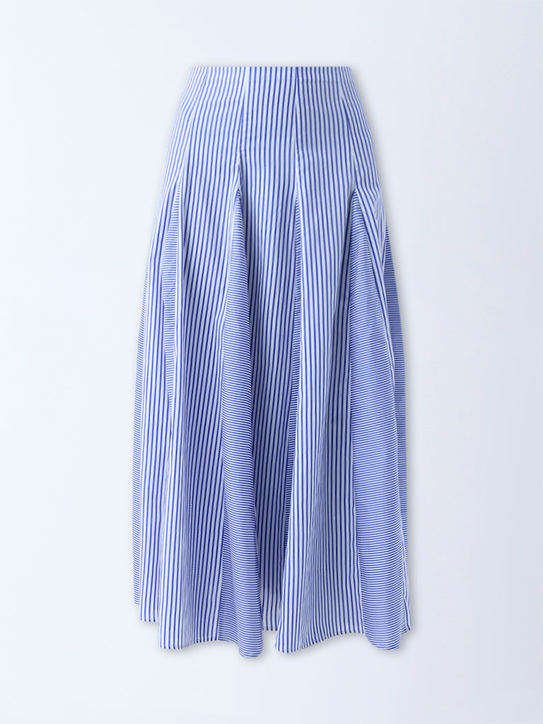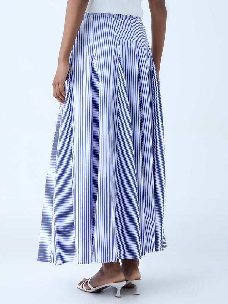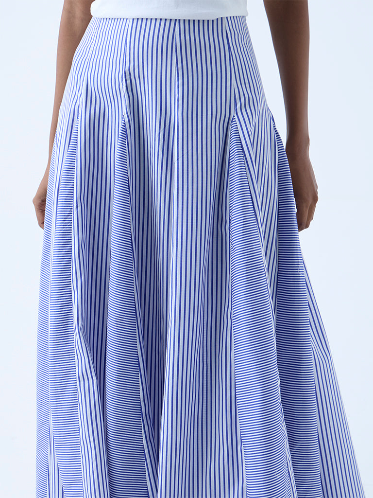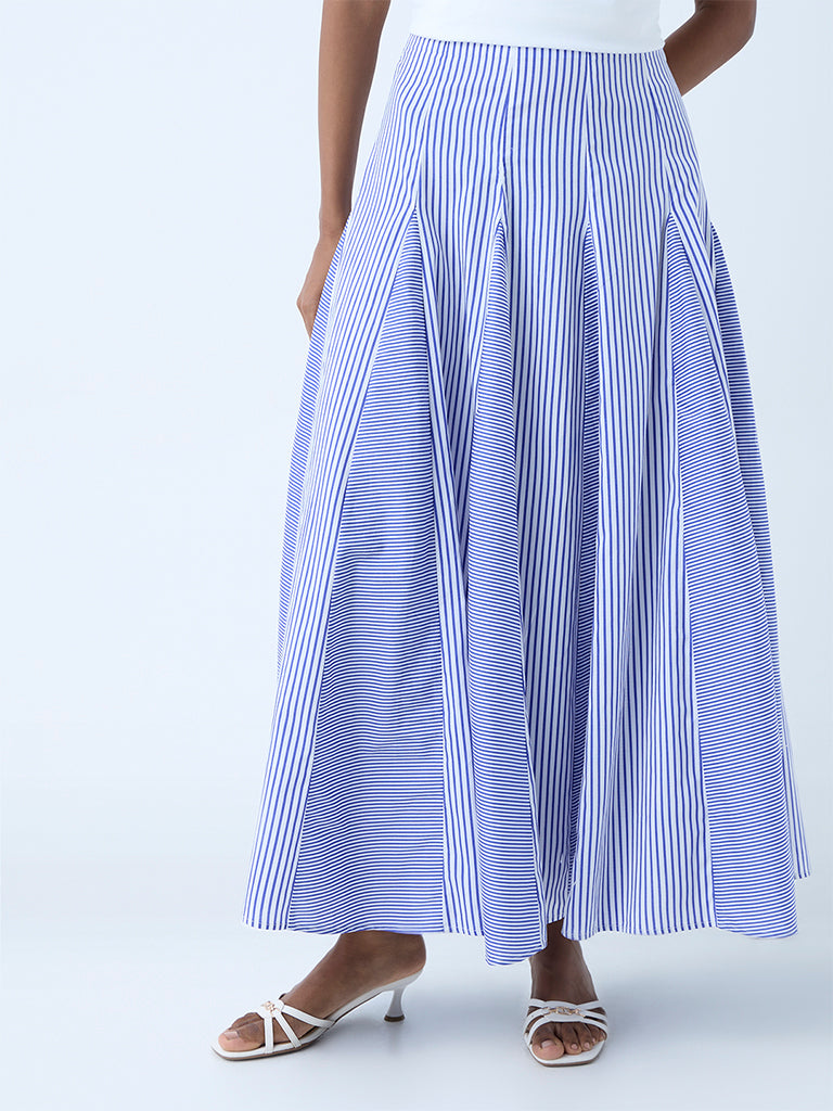 This navy maxi skirt from LOV is patterned with classic stripes that add depth without overwhelming the silhouette. Cut from pure cotton. it delivers soft breathability and a lightweight feel. The smooth waistband and concealed zipper closure create a tailored fit at the waist.