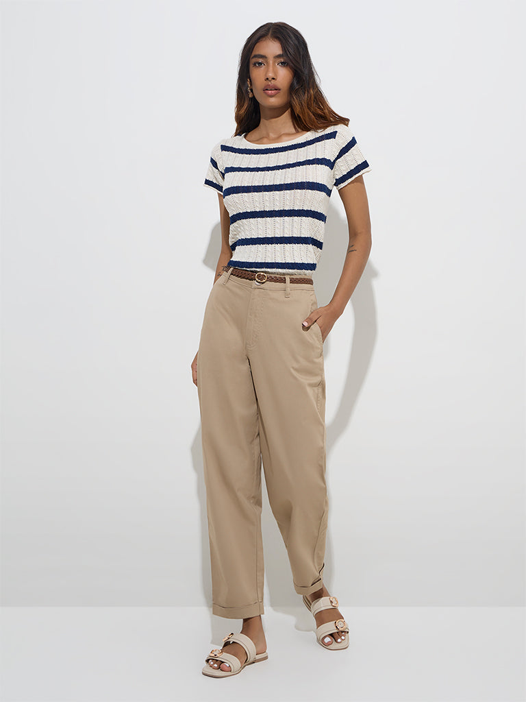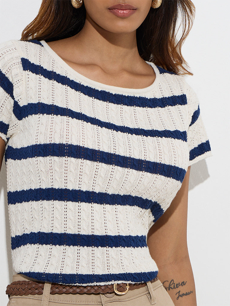 Crafted from a knit-textured fabric. this navy top from LOV flaunts striped designs. Its breathable composition ensures superior comfort. while the round neck and short sleeves complete it.