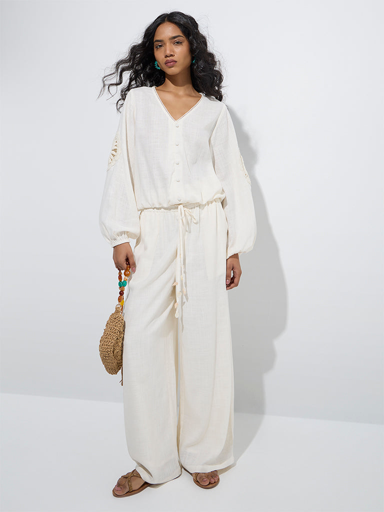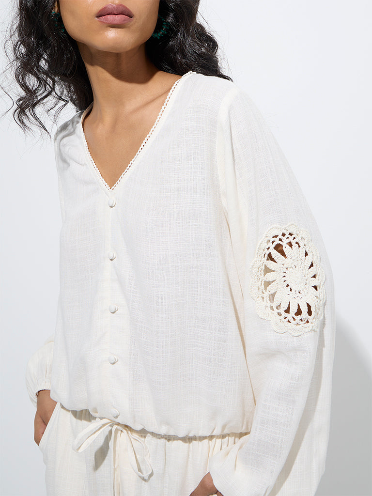 LOV presents this off-white blouse crafted from a rich linen-blend for a breezy and elegant feel. Designed with intricate crochet embroidery for a feminine touch. it features a flattering V-neckline. button-down front. and full sleeves. perfect for effortless everyday styling.