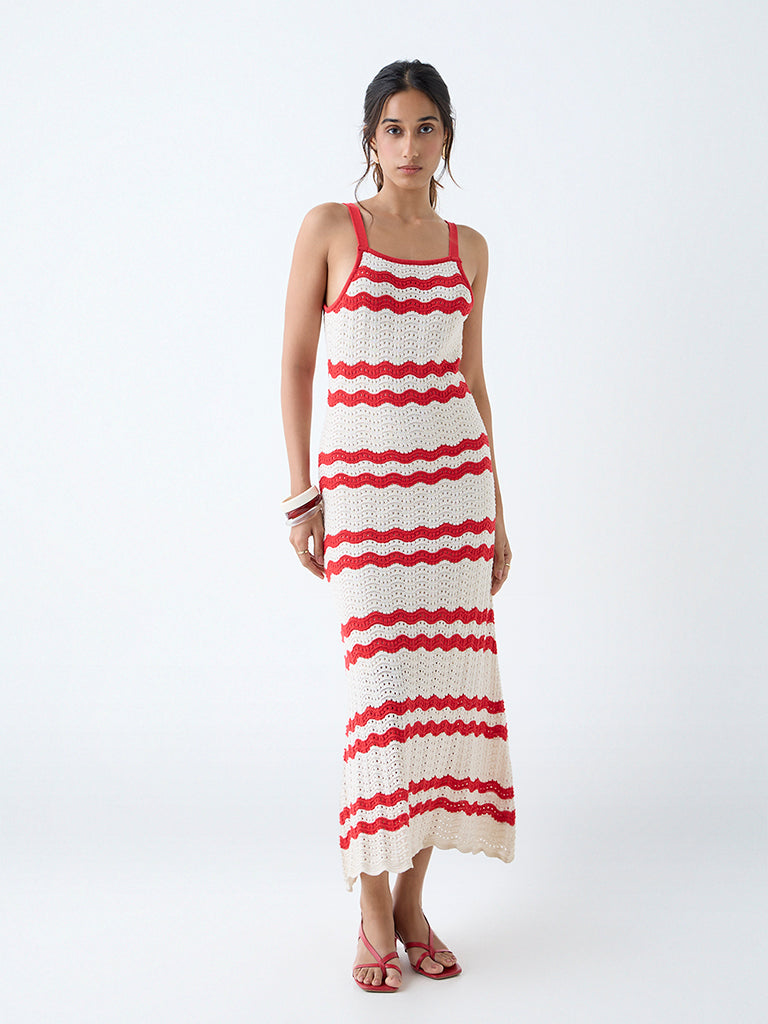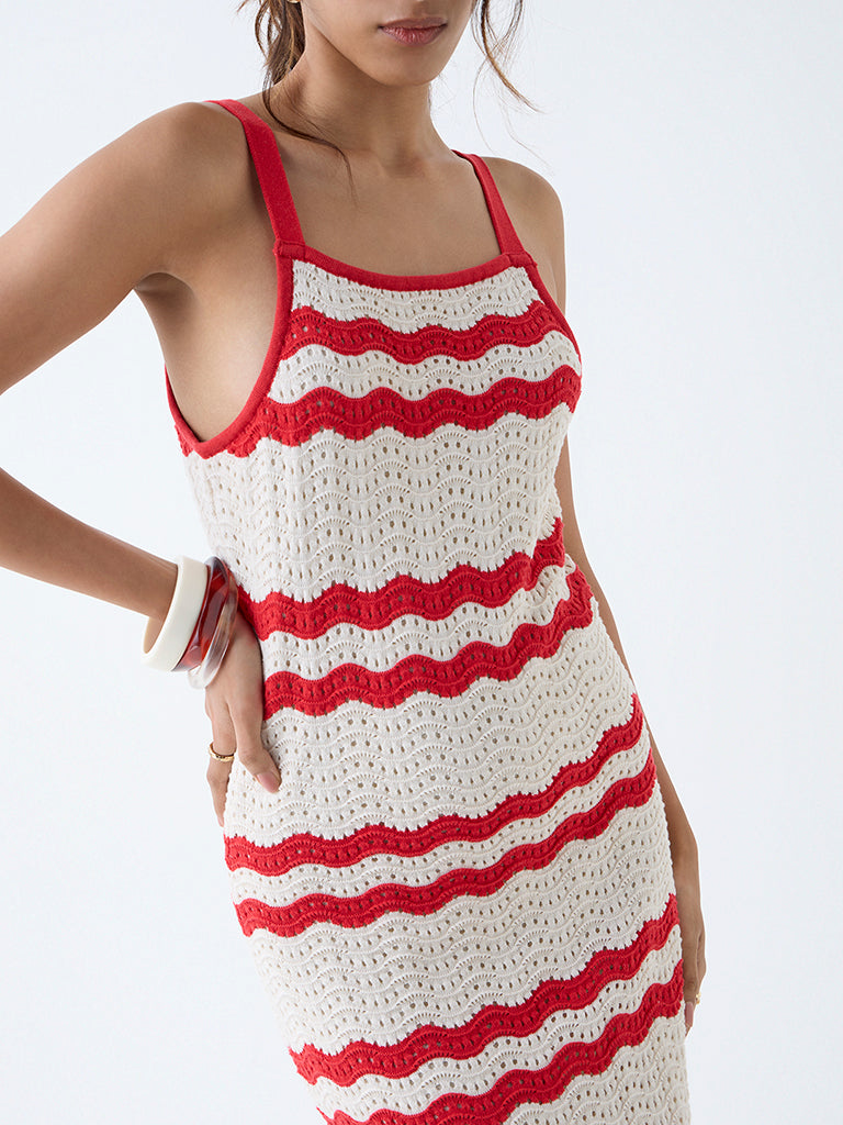 LOV channels effortless summer styling with this off-white crochet-knit dress. Woven from a premium cotton-blend fabric. it features spaghetti straps and a square neck. The wavy stitch pattern adds a playful touch. making it an easy statement for beach days. brunches. or balmy evening plans.
