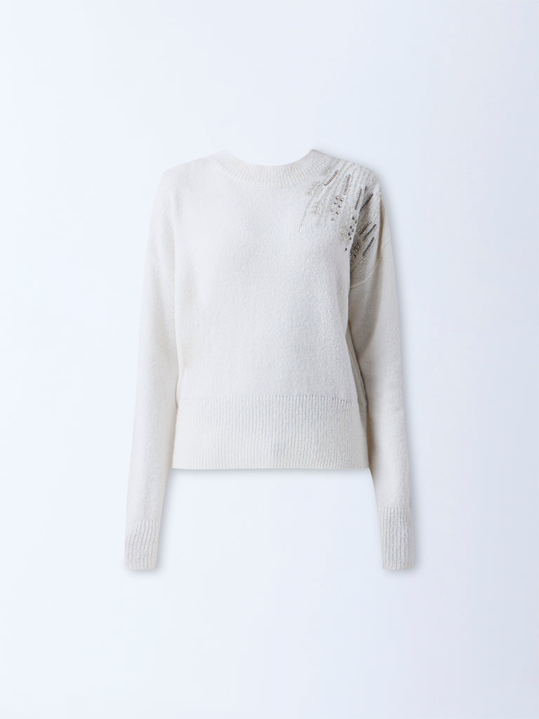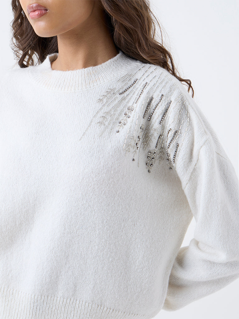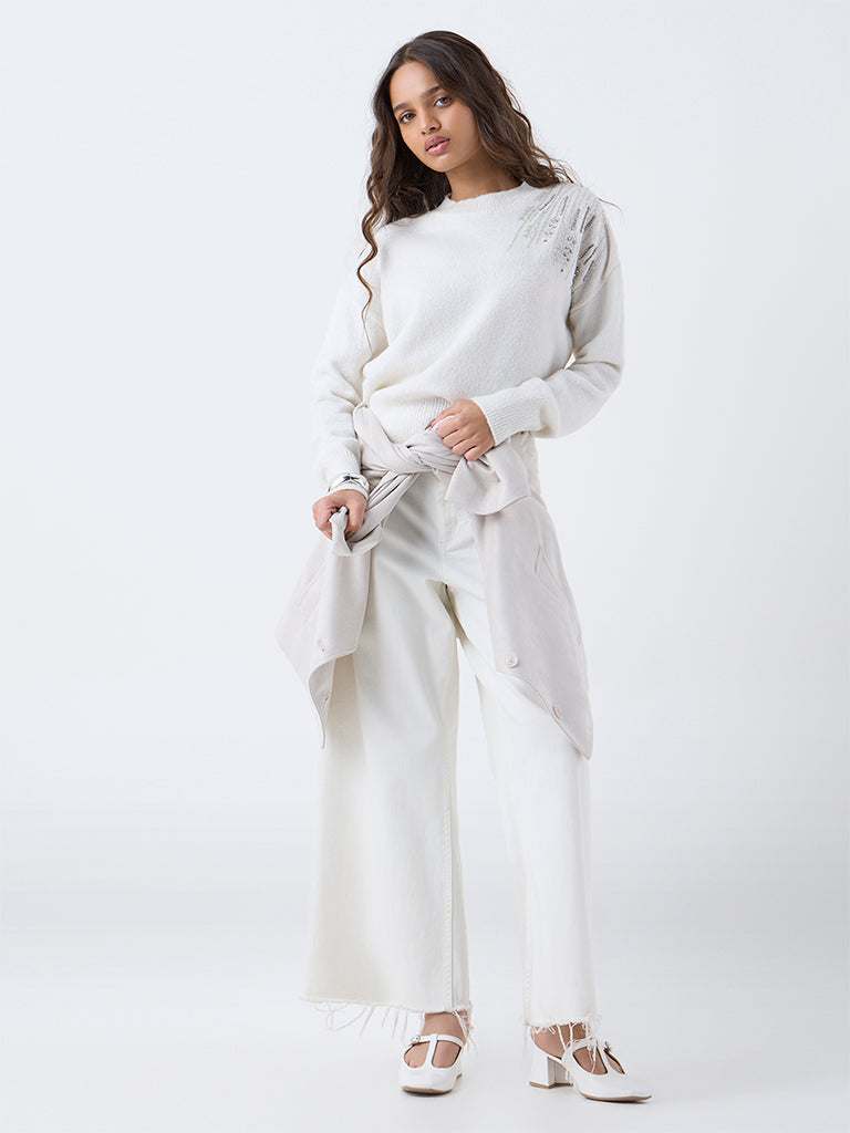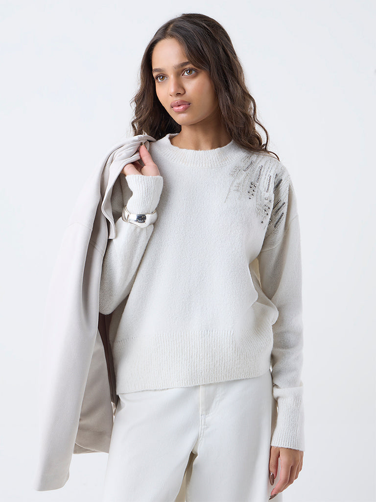 A fresh take on winter elegance. this off-white sweater from LOV is styled with a crew neck and full sleeves for a relaxed silhouette. It features embellished details that adds a hint of bling. Made from sumptuous fabric blend for cozy warmth and a snug feel. this is an easy choice for day-to-evening wear.