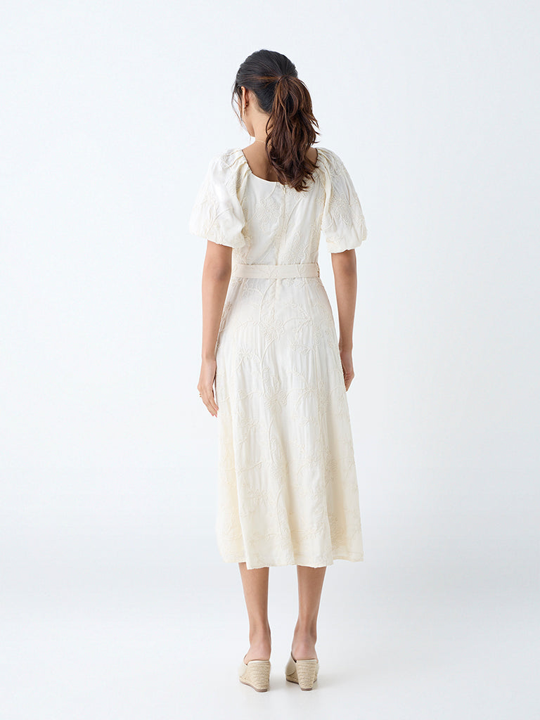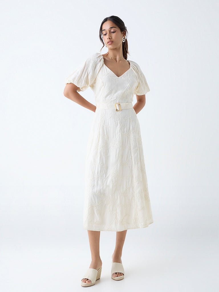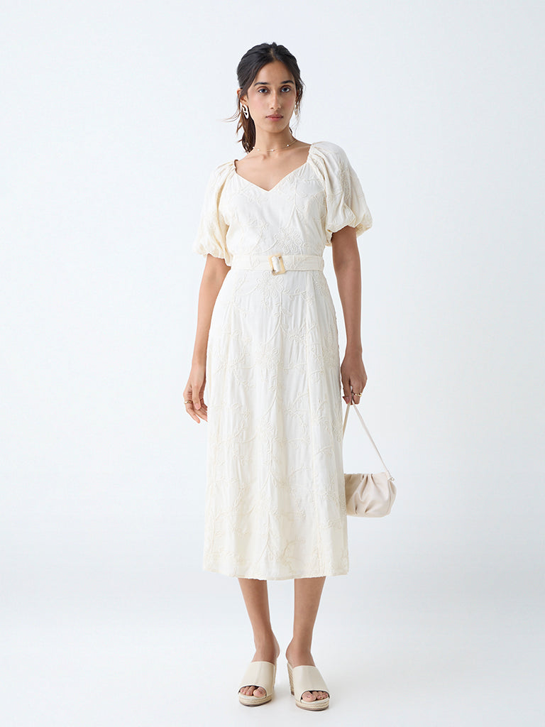 LOV Off-White Embroidered Cotton A-Line Dress with Belt