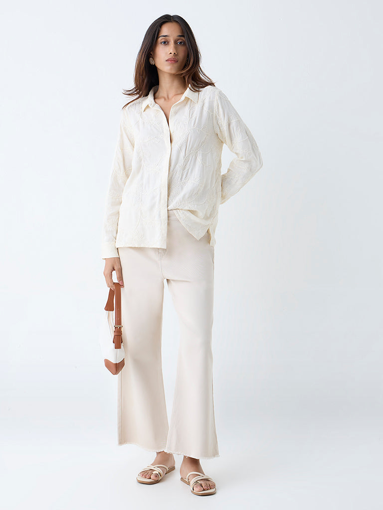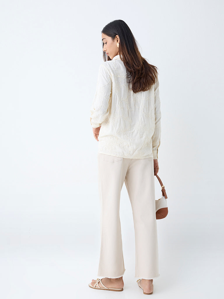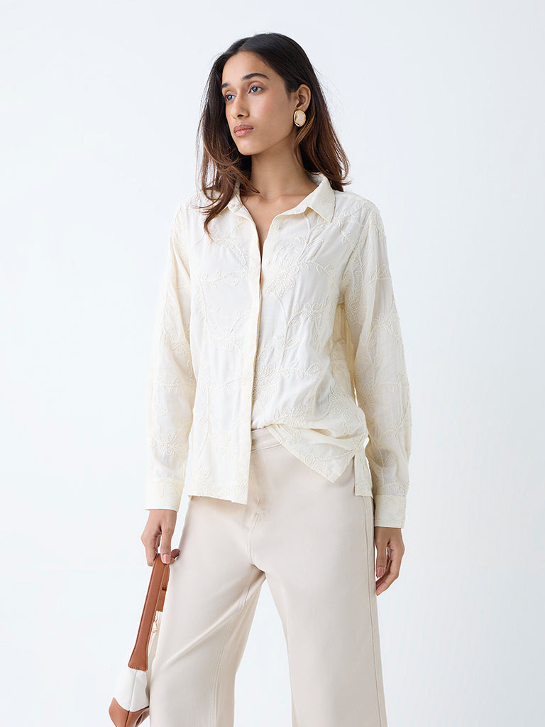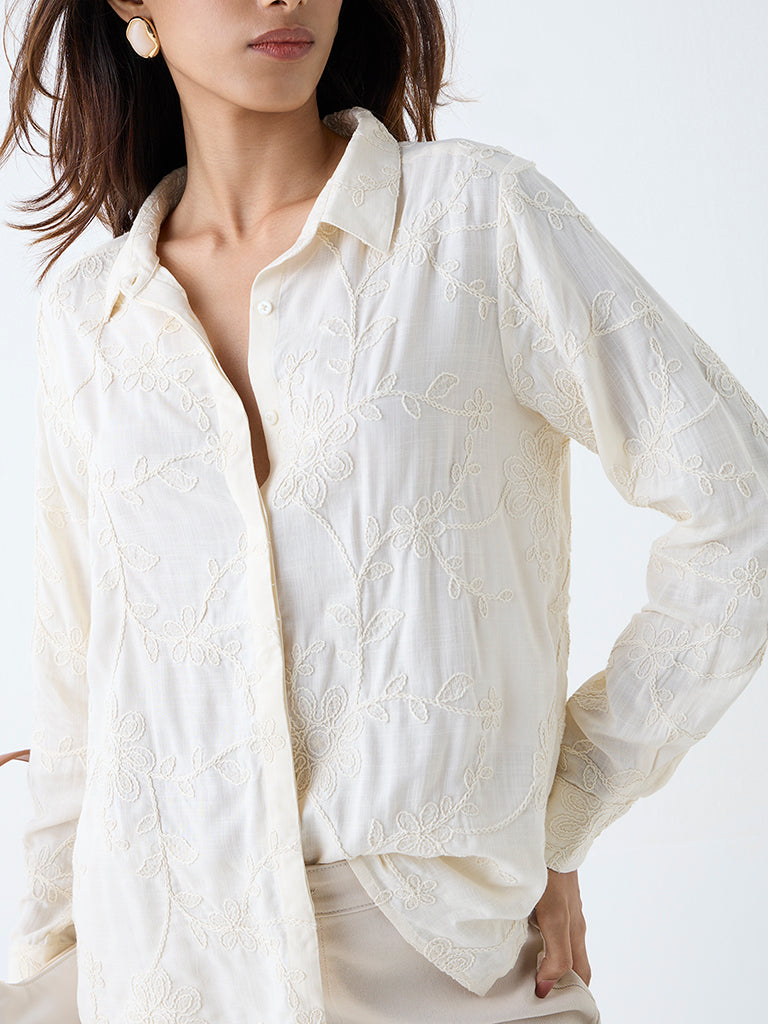 This off-white shirt from LOV is a versatile staple that moves effortlessly from day meetings to after-dark plans. Defined by its exquisite floral embroidery. its crafted from premium fabric for all-day comfort. The spread collar. full sleeves. and concealed placket keep the silhouette polished.