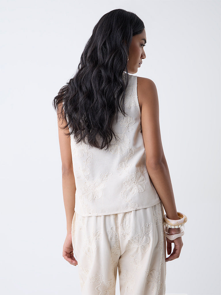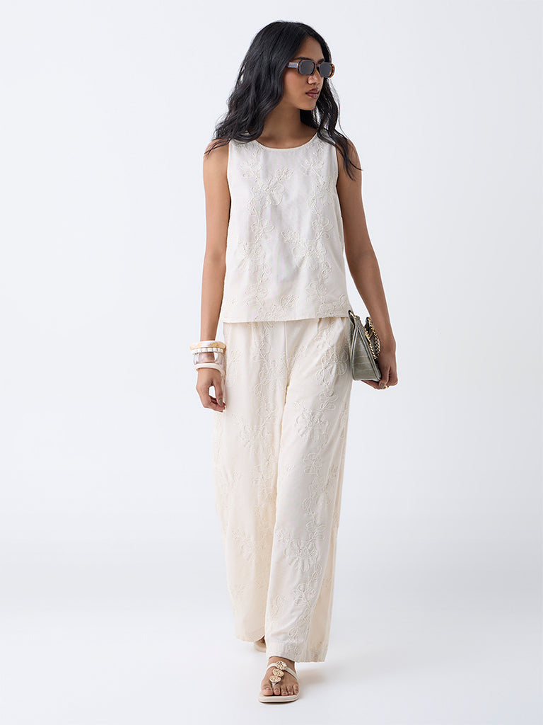 Curate your holiday edit with this off-white top by LOV. where graceful floral embroidery elevates a minimalist silhouette. Woven from a sumptuous fabric. it features a round neck and sleeveless cut. blending comfort with refined style.