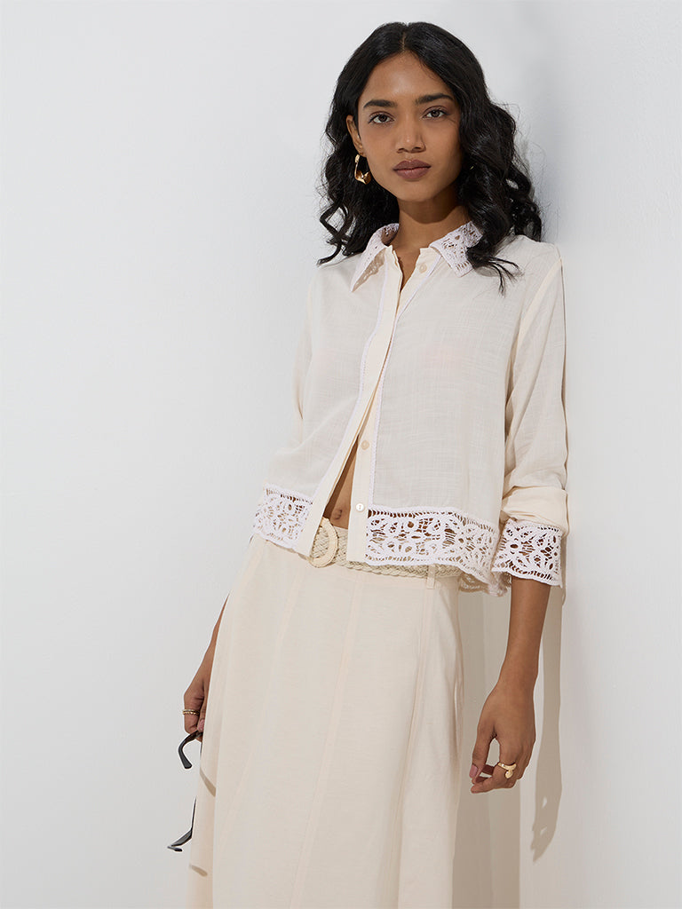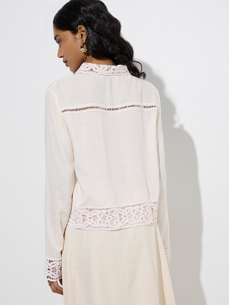 Delicate lacework lends a romantic charm to this off-white shirt from LOV. Milled from a lightweight fabric. it features a classic collar. a button placket. and full sleeves. making it a refined staple for effortlessly elegant ensembles.